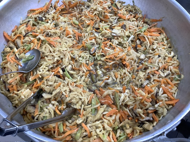切干大根、にんじん、干し椎茸、インゲン、油揚げを甘辛い調味料で煮込みます。