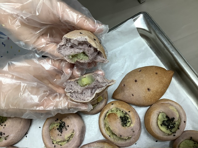 鹿児島県産の紫芋パウダーを加えて、紫色のパン生地を作り、少し甘さを加えたさつまいものペーストを生地に入れました。