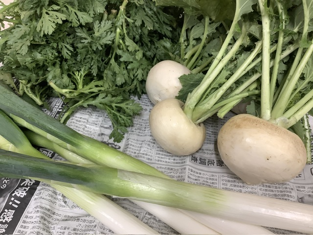 深葱はレンコンバーグに、カブはすまし汁、沢山の春菊はサラダに使用しました。