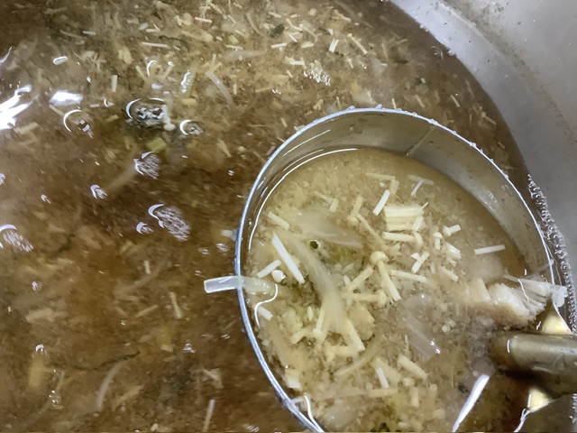 おぼろ汁には、えのきたけ、玉ねぎ、桜島大根の大根おろし、桜島大根の葉が入りました。