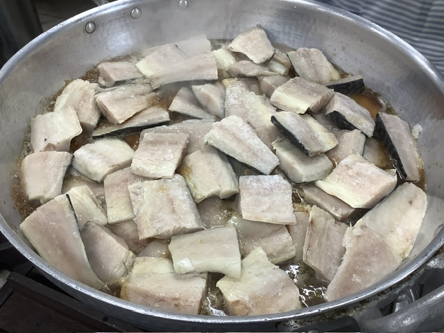 すりおろした桜島大根・35ファームの深ねぎ・生姜と調味料を煮立て、鯖をじっくり煮込みました。