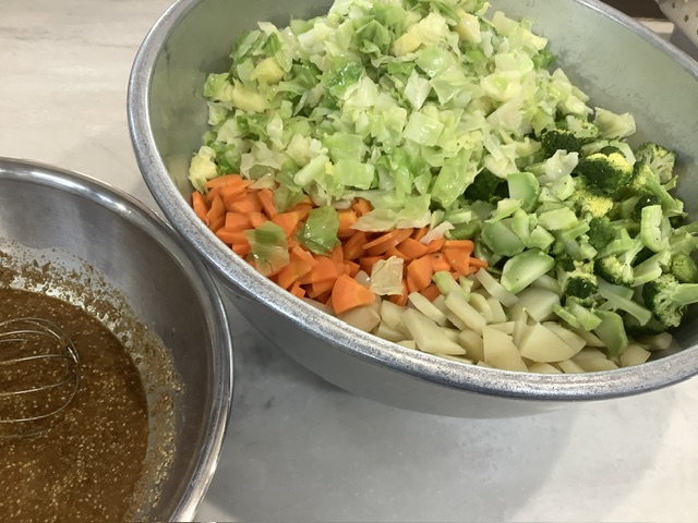 35ファームのじゃがいも・にんじん・キャベツ・ブロッコリーをスチームで蒸し、給食室手作りのごまだれで和えました。