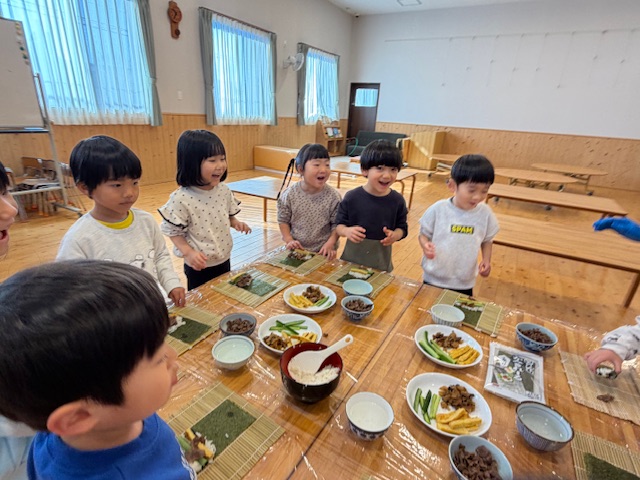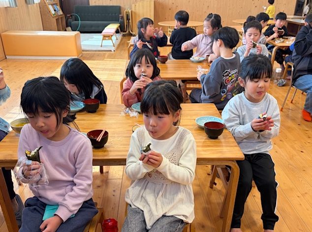 さくら組では、今年の恵方である南南東の方角を向いて喋らずに食べきろうとしているこども達の姿もありました。