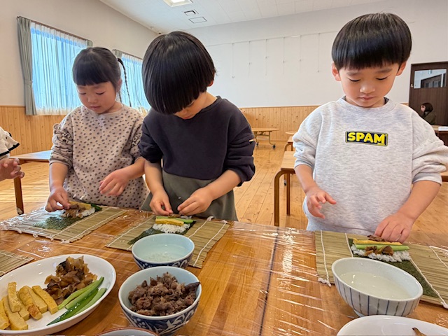 出来上がった巻きずしに、こども達も「みてみてー!」「きれいにつくれたよ」と達成感いっぱいの笑顔を見せてくれました。