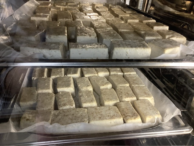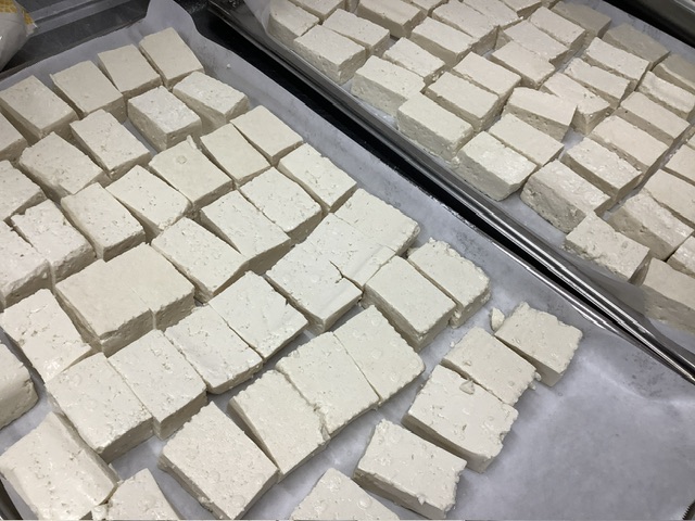 スチームで水切りした木綿豆腐に、塩こしょうで下味を付けて小麦粉とごま油をまぶしてオーブンで焼き上げました。