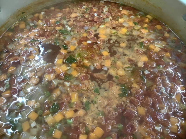 大丸かつおパックで出汁を取り、南州農場のハム・玉ねぎ・にんじん・じゃがいも・セロリをじっくり煮込みます。最後にカットトマト・薄口醤油・無添加洋風だしで味を調えました。