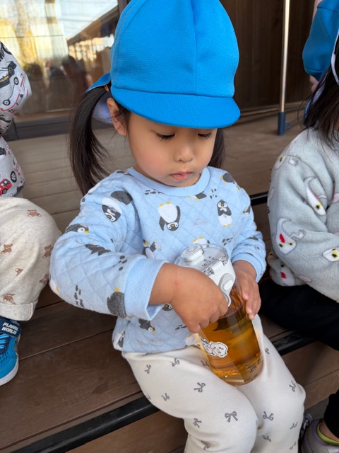 全員が同じ種類の水筒を使用しているため、シール等で目印をつけていただきました。自分で貼ったシールを教えてくれたり、愛着が湧いて丁寧に使ったりと、水筒の使用にも慣れてきました。