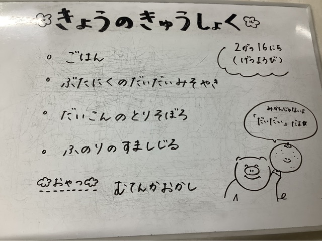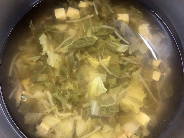 ふのり、もやし、木綿豆腐、35ファームの白菜が入りました。かつお節と昆布でとった出汁と野菜の旨味が合わさり、身体温まる美味しいすまし汁に仕上がりました。