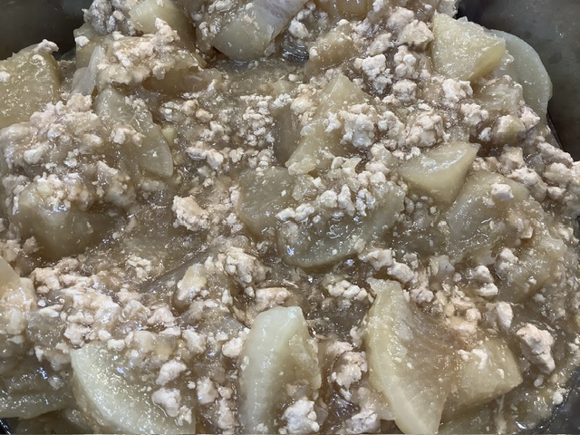 かつお節と昆布でとった出汁と調味料でじっくり煮込みます。仕上げに片栗粉でとろみをつけたら出来上がりです。優しい味わいの大根の鶏そぼろに仕上がりました。今が旬の大根は甘みもあり、とても美味しいですね。
