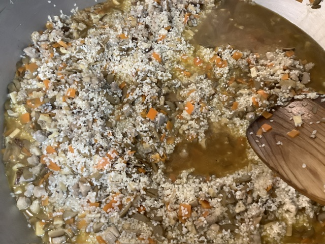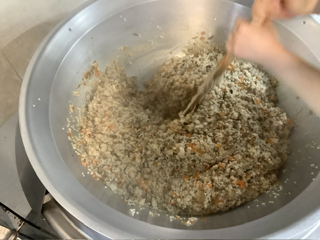 具材をよく炒め、調味料に干し椎茸の戻した汁を加え、もち米を入れてから、水分を吸わせます。