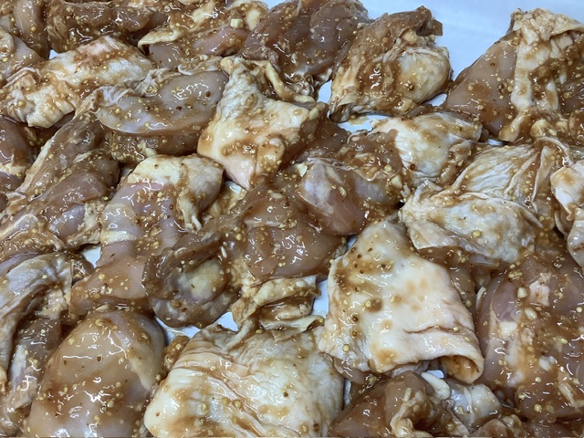 一真から届いた鶏肉に、粒マスタード、ケチャップ、濃口醤油、酒、味の母、塩胡椒を一緒に漬け込みます。