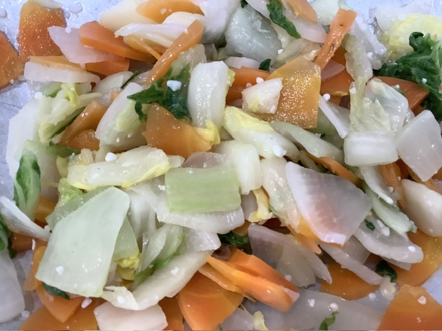 大根、にんじん、35ファームの白菜を、給食室手作りの塩麹で合わせました。