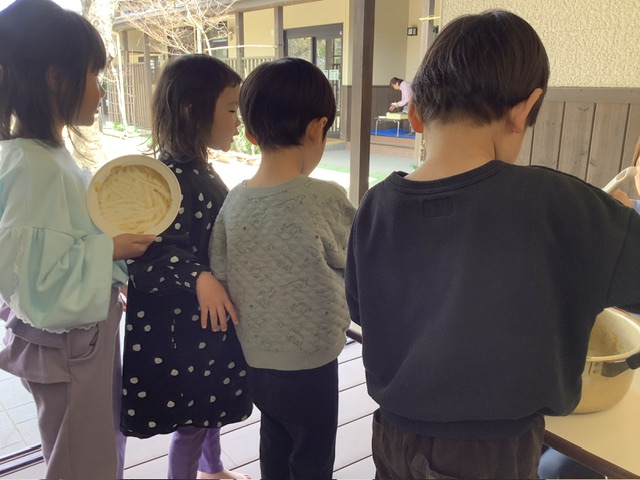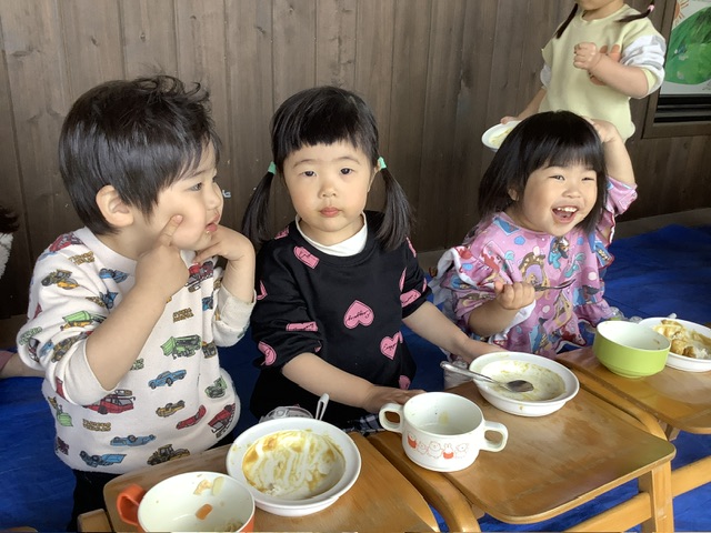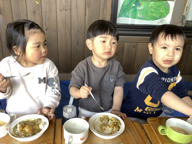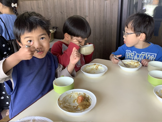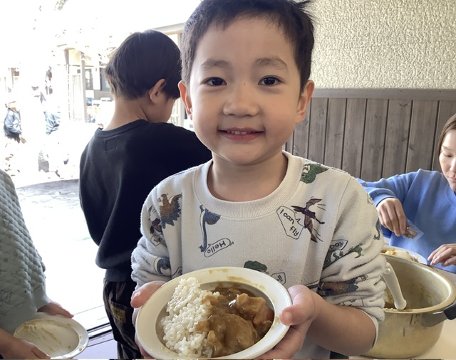 天気も良く日差しも穏やかだった今日、ゆり組ともも組のこども達は、テラスでカレーを食べました✨