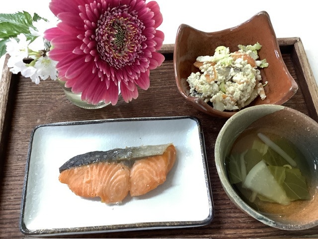 鮭に塩をふり、スチコンで焼き上げました。