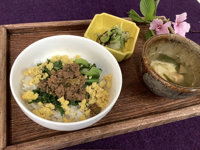 ご飯の上に、それぞれ盛り付けたら完成です。葉にんにくの香りが食欲を掻き立て、卵のふわふわ食感と、かつお菜のシャキシャキした歯応えがたまりません。口の中を幸せにしてくれる、美味しいそぼろ丼に仕上がりました。