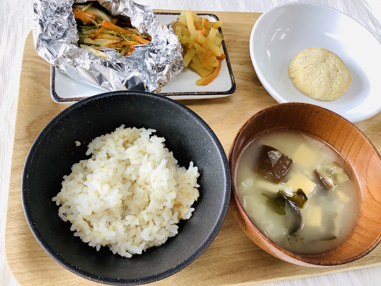 今日のメニューは“魚の包み焼き”“じゃがいもきんぴら”“キャベツのみそ汁”でした。