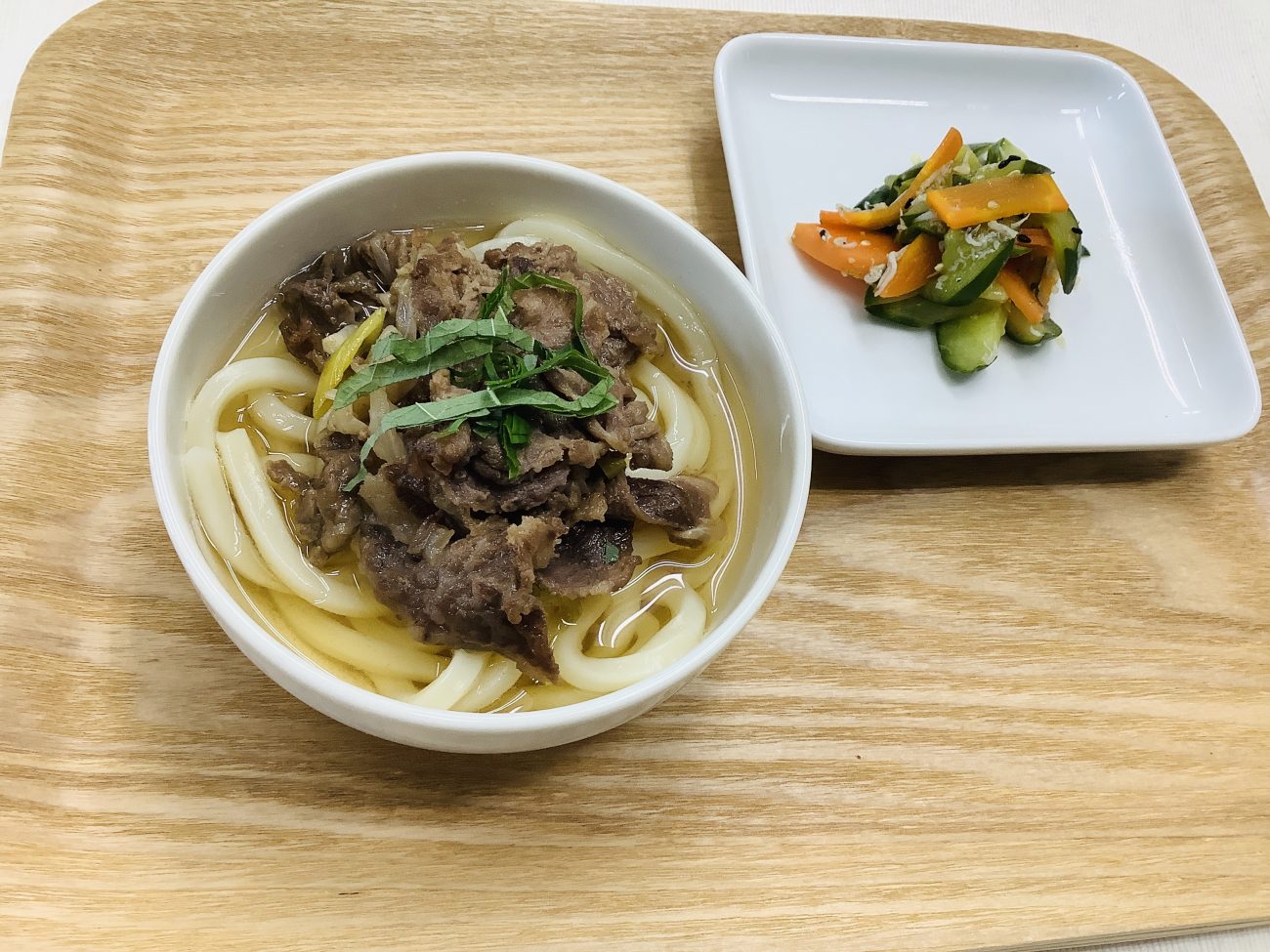 今日のメニューは“肉うどん”“きゅうりとしらすの酢の物”でした。