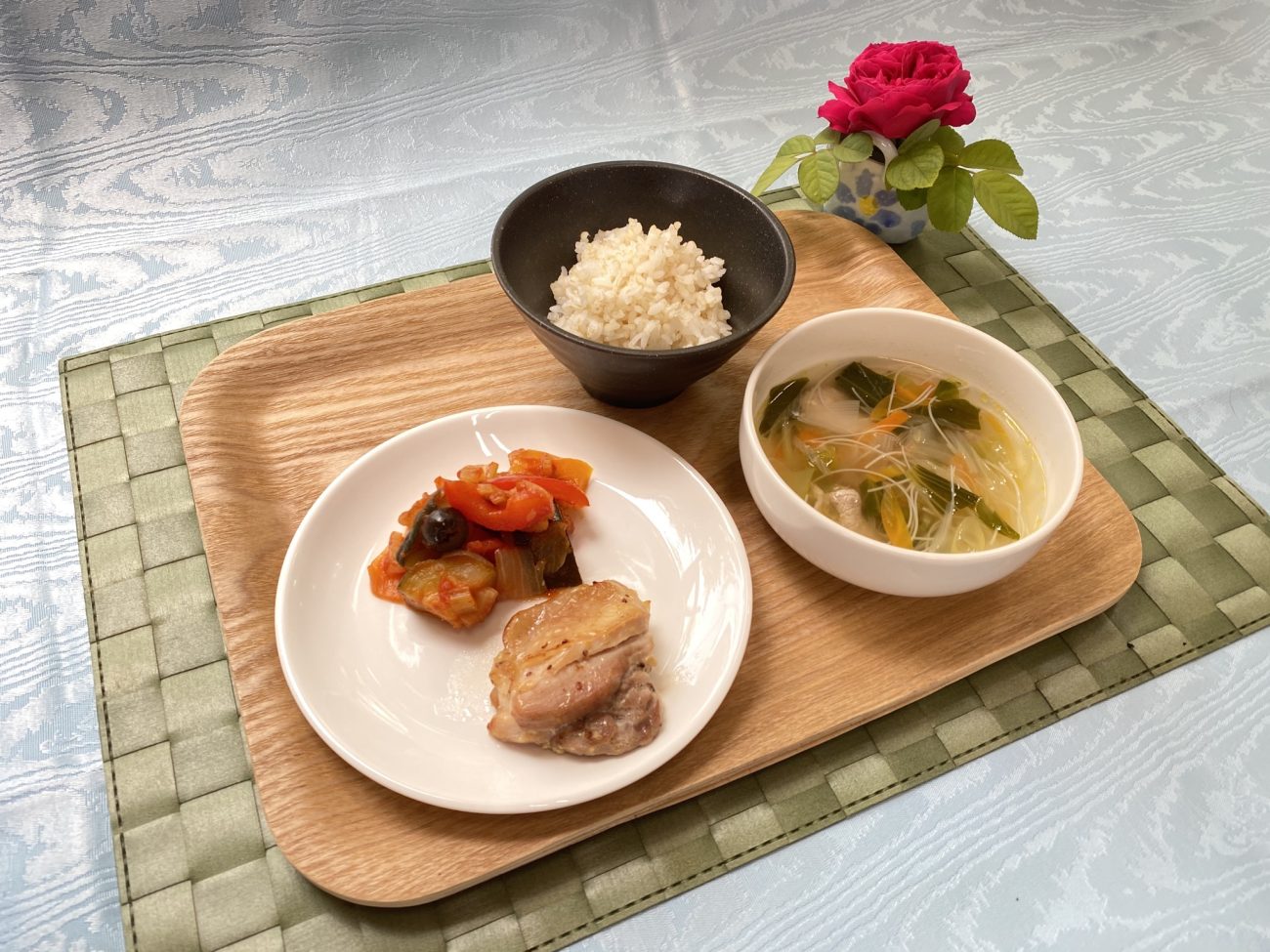 今日のメニューは“鶏肉のハニーマスタードソテー”“ラタトゥイユ”“ビーフン汁”でした。