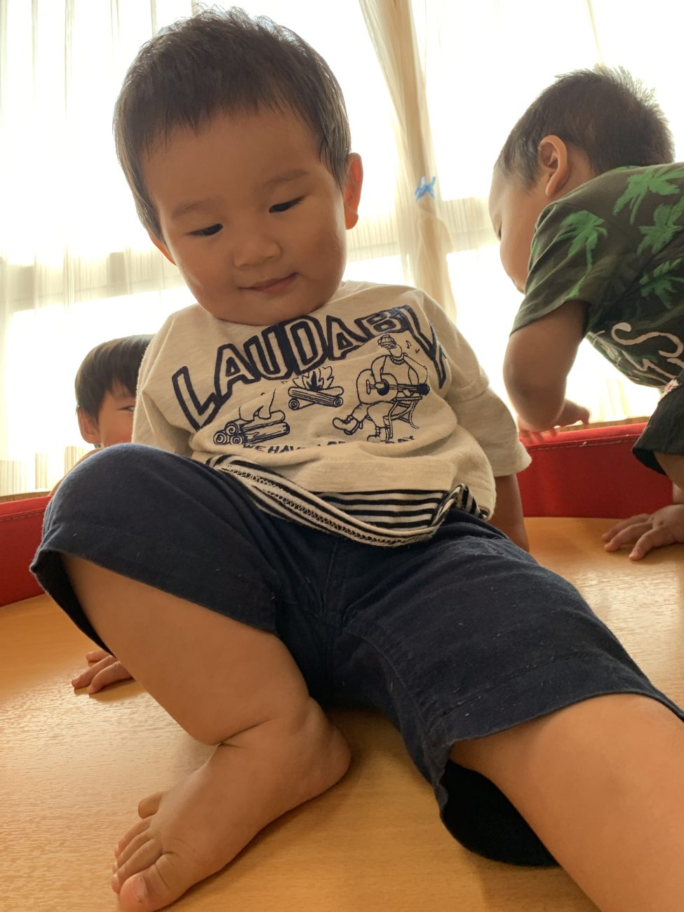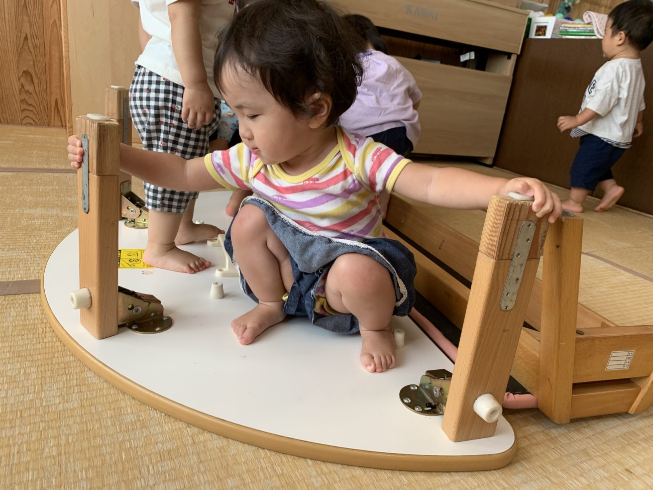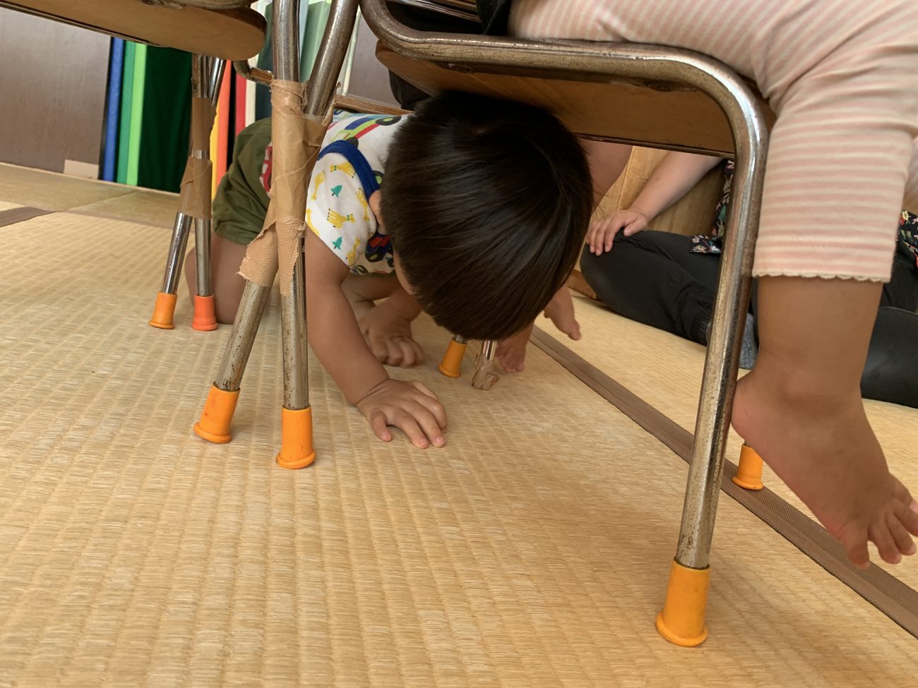 3つの装置を設定し、その中で子ども達は自由に遊びます。また、普段使っている机よりも低い高さを意識することで大きな怪我に繋がらないようにしました。