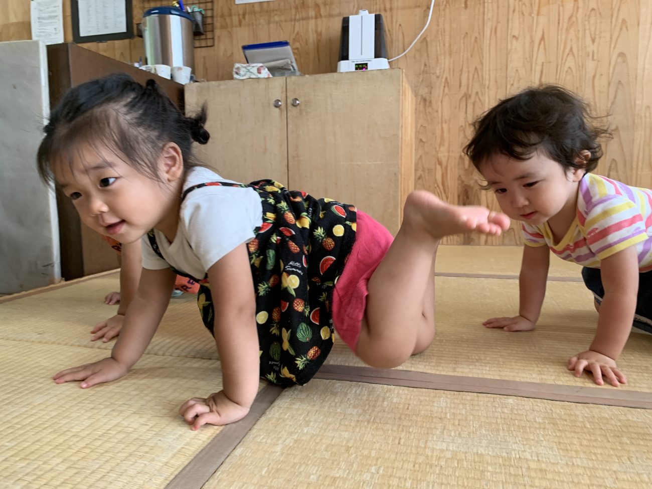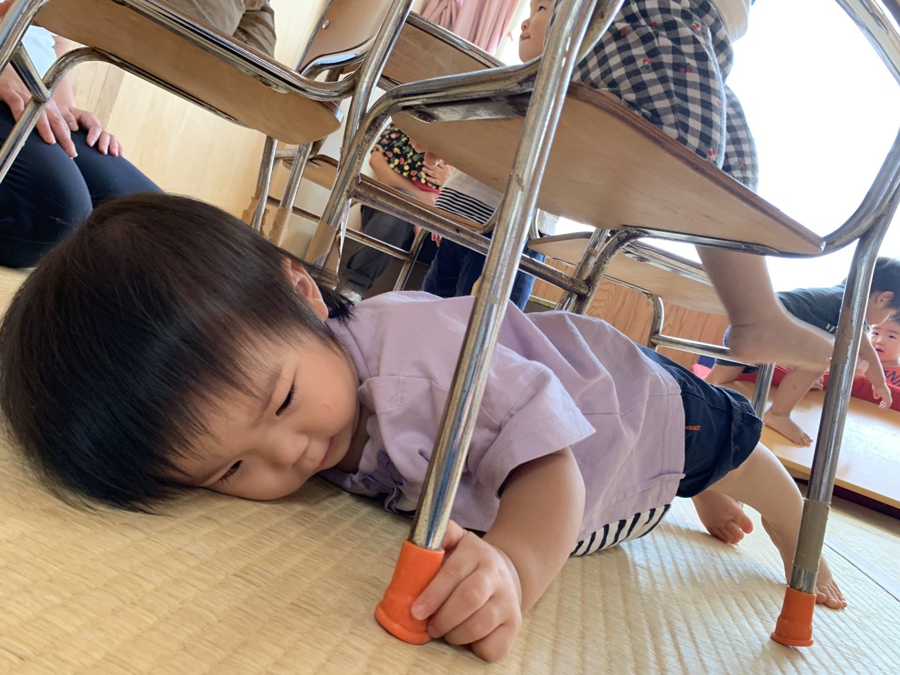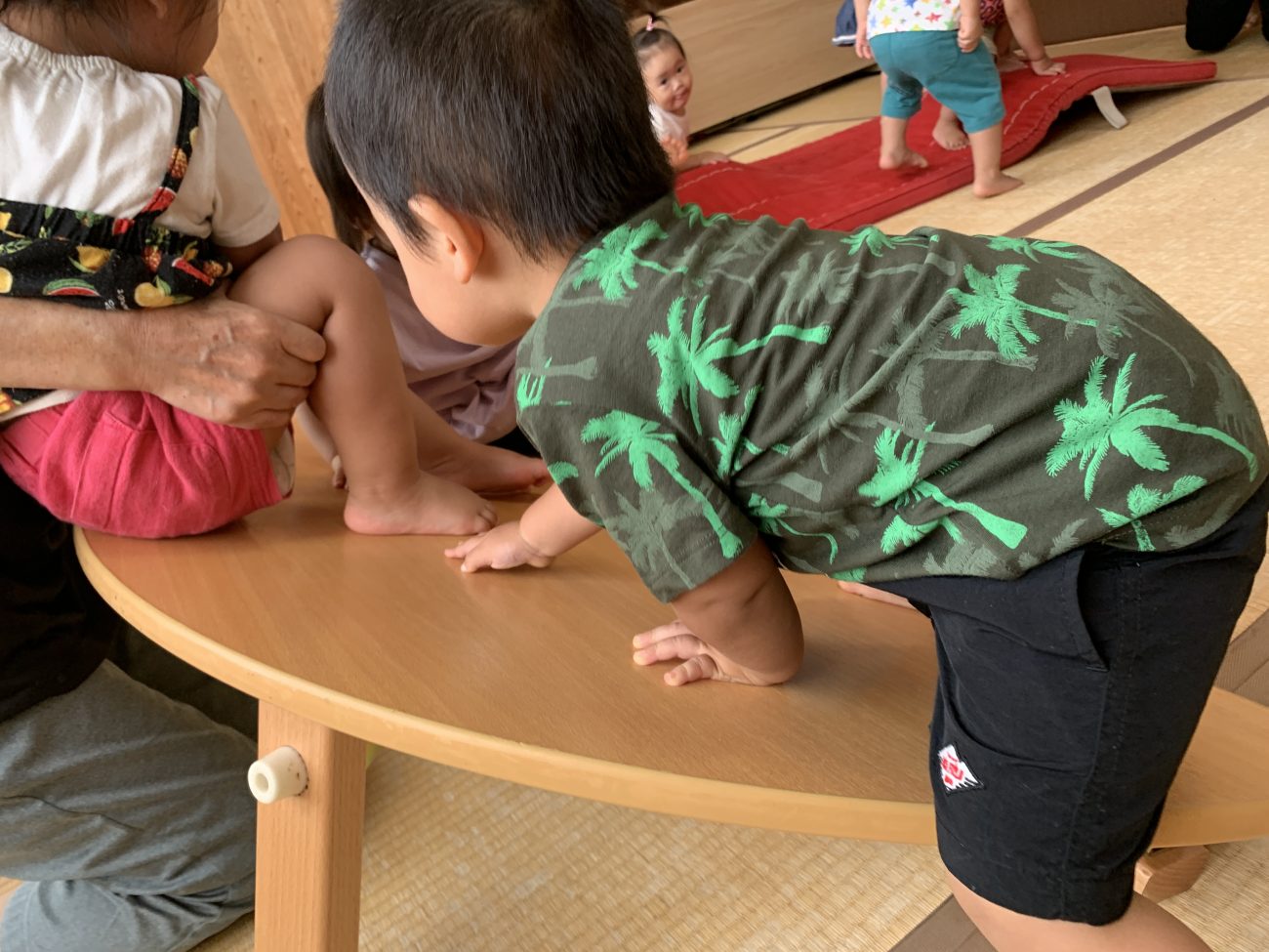 3つの装置を設定し、その中で子ども達は自由に遊びます。また、普段使っている机よりも低い高さを意識することで大きな怪我に繋がらないようにしました。