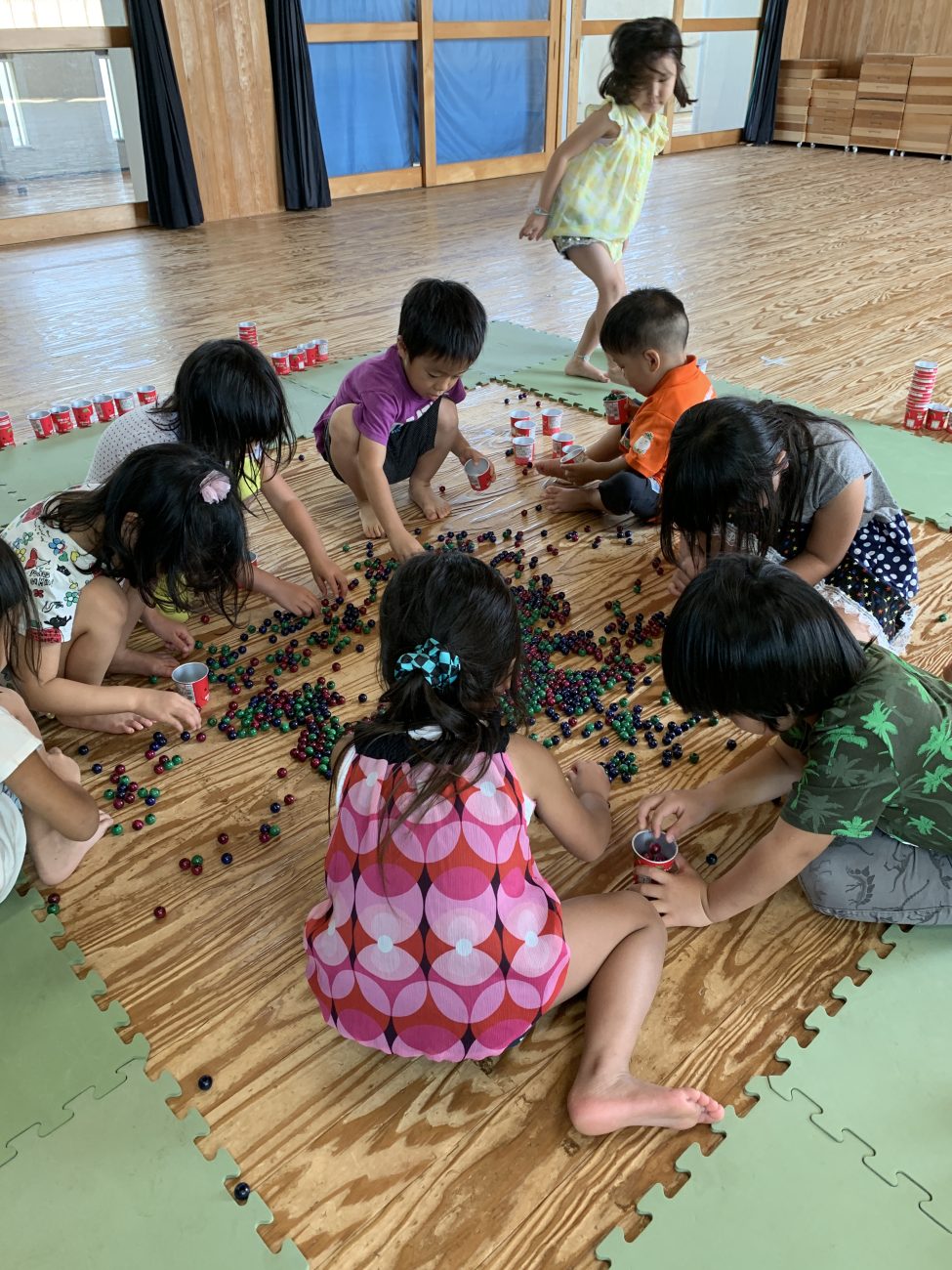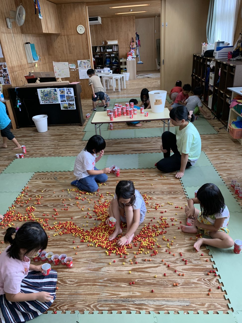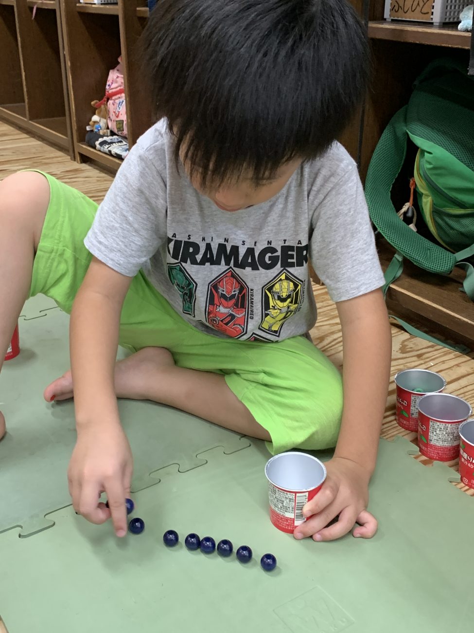 1つのカップに10粒ずつ集める遊びを楽しみました。