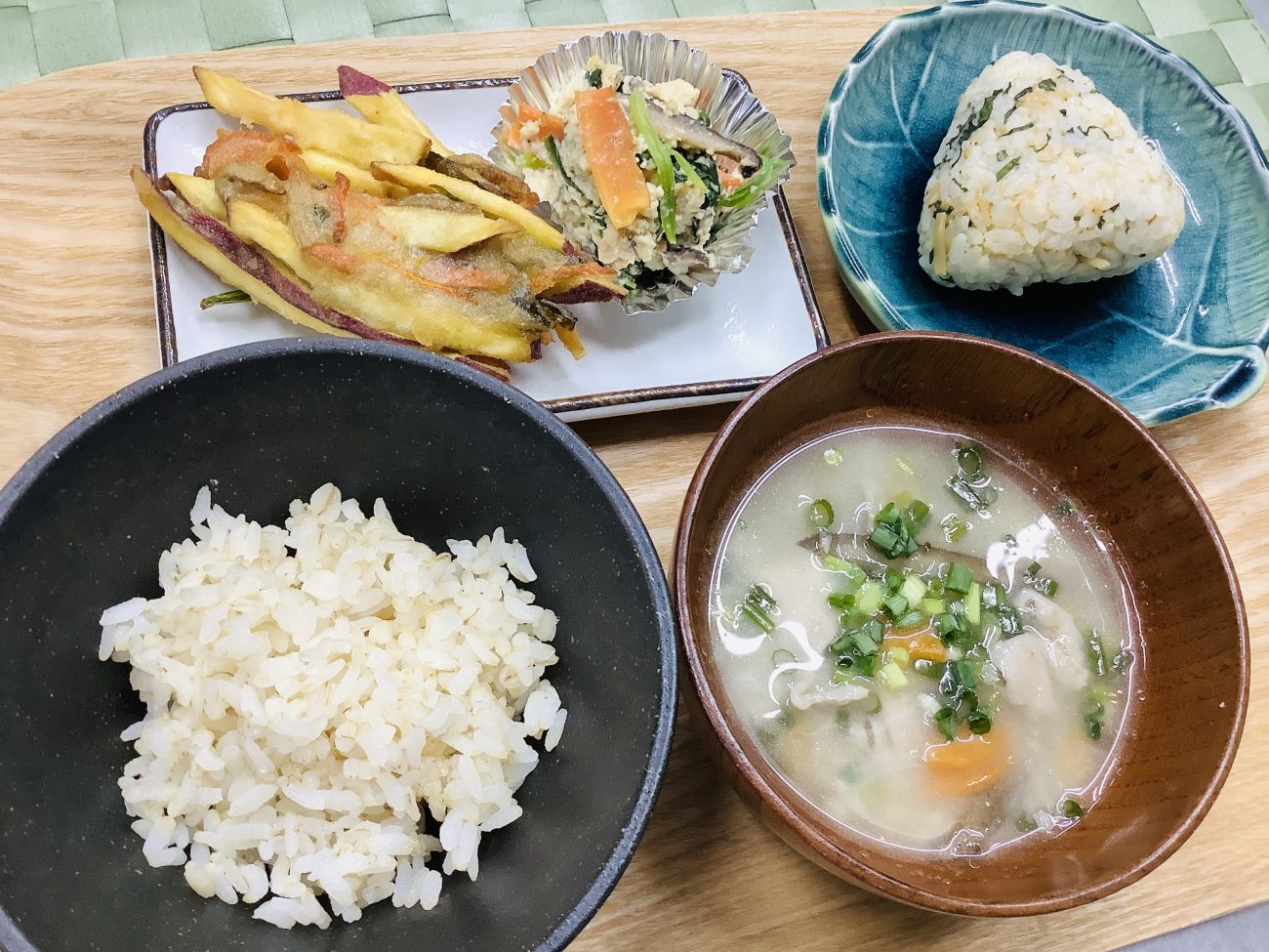 今日は郷土料理の日でした。芋がねには、ごぼう、にんじん、ニラも入っていてさつま芋がメインです。ごぼうは蒸し煮をして下処理をしているので、柔らかく、良い香りがします。ニラも良い味のアクセントになりました。また、ころもは小麦粉と米粉を混ぜて作りました。こうすることで、外側はサクサク感があり、なかはもっちりしています。