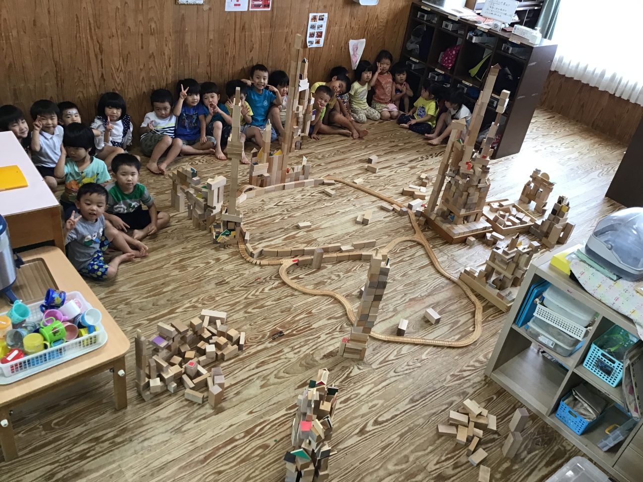 今月は、隣のこども園のお友達と一緒に積木で街づくりをしたり、トーマスの線路を使って街づくりをしたりと積木遊びを多く取り入れました。