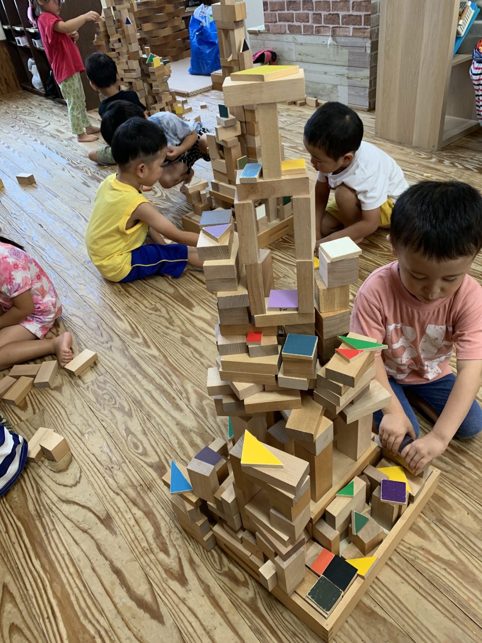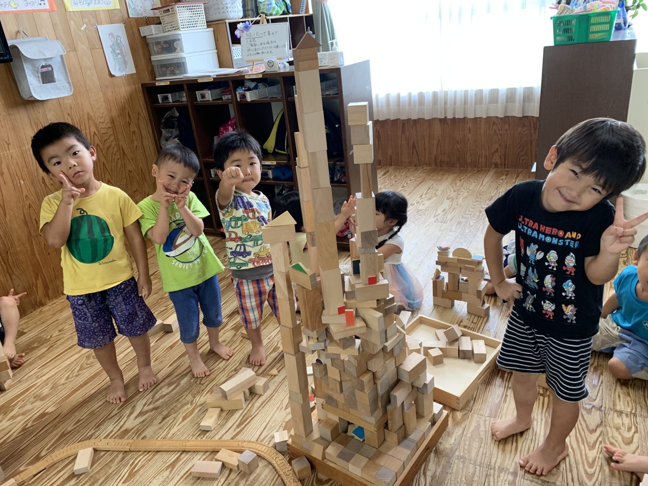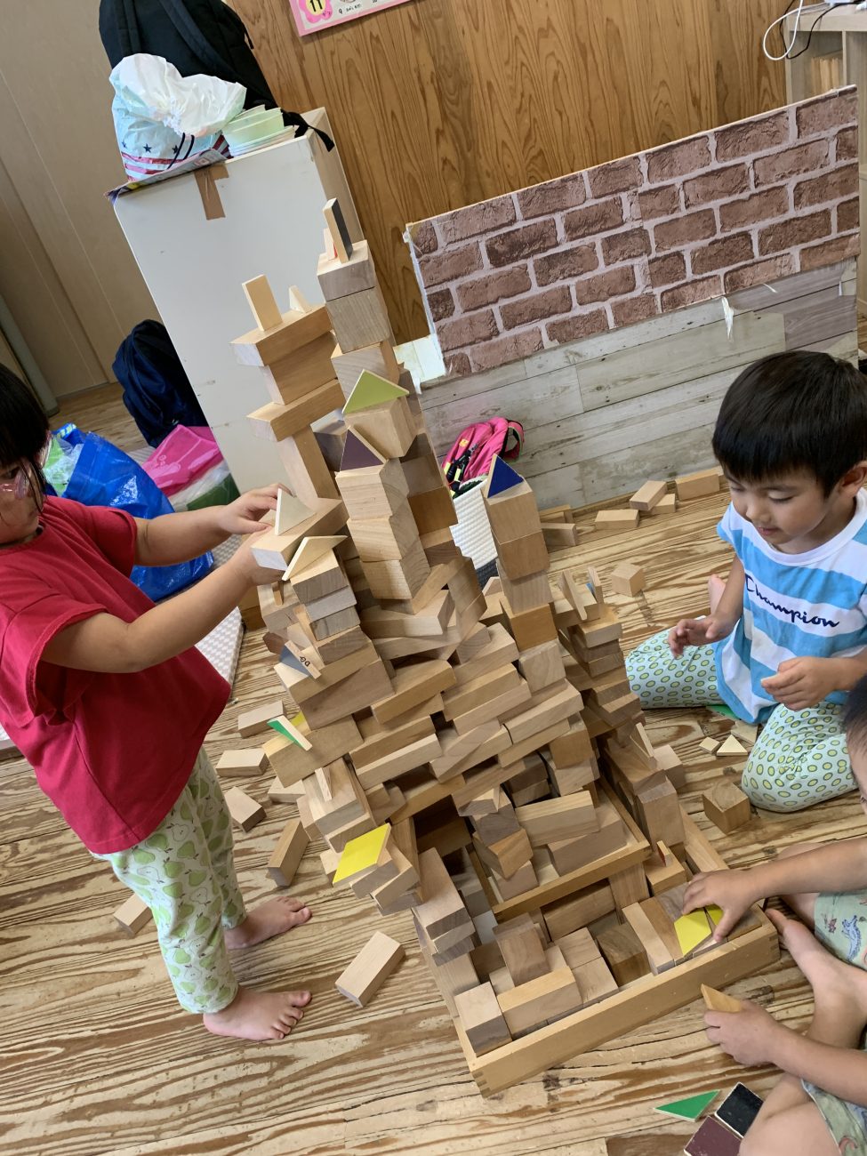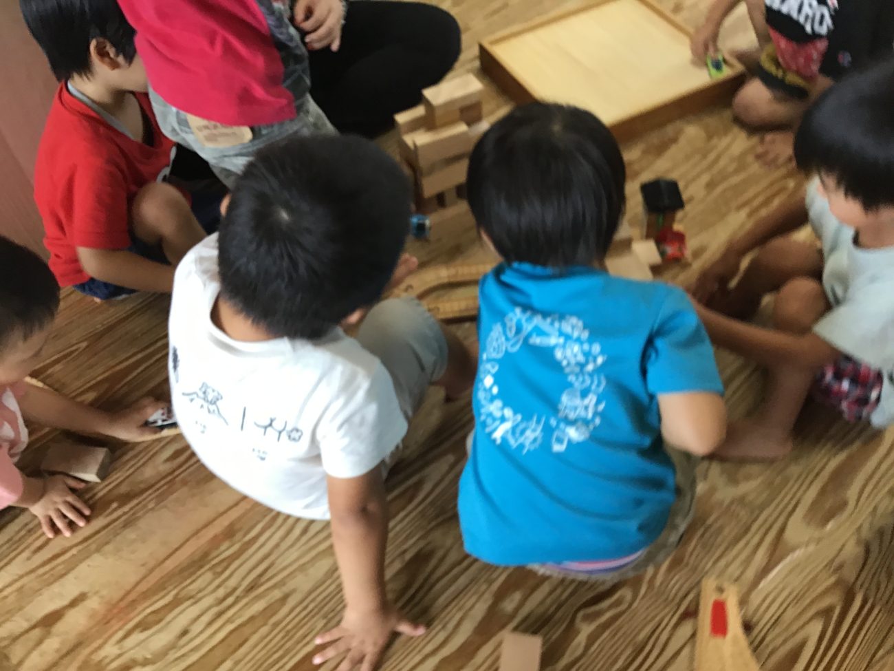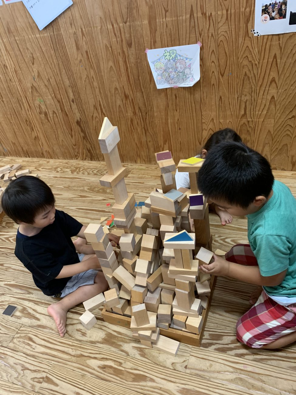 毎回、積木遊びで同じ作り方をする子が少ないことや完成する物が異なる理由として、協力して作る友達が日によって異なり、意見や発想が様々だからだと私は思っています。