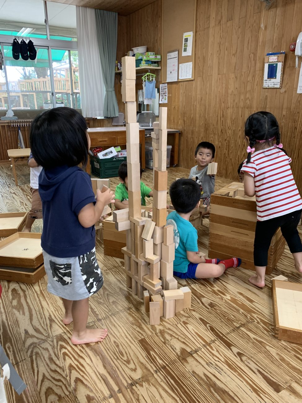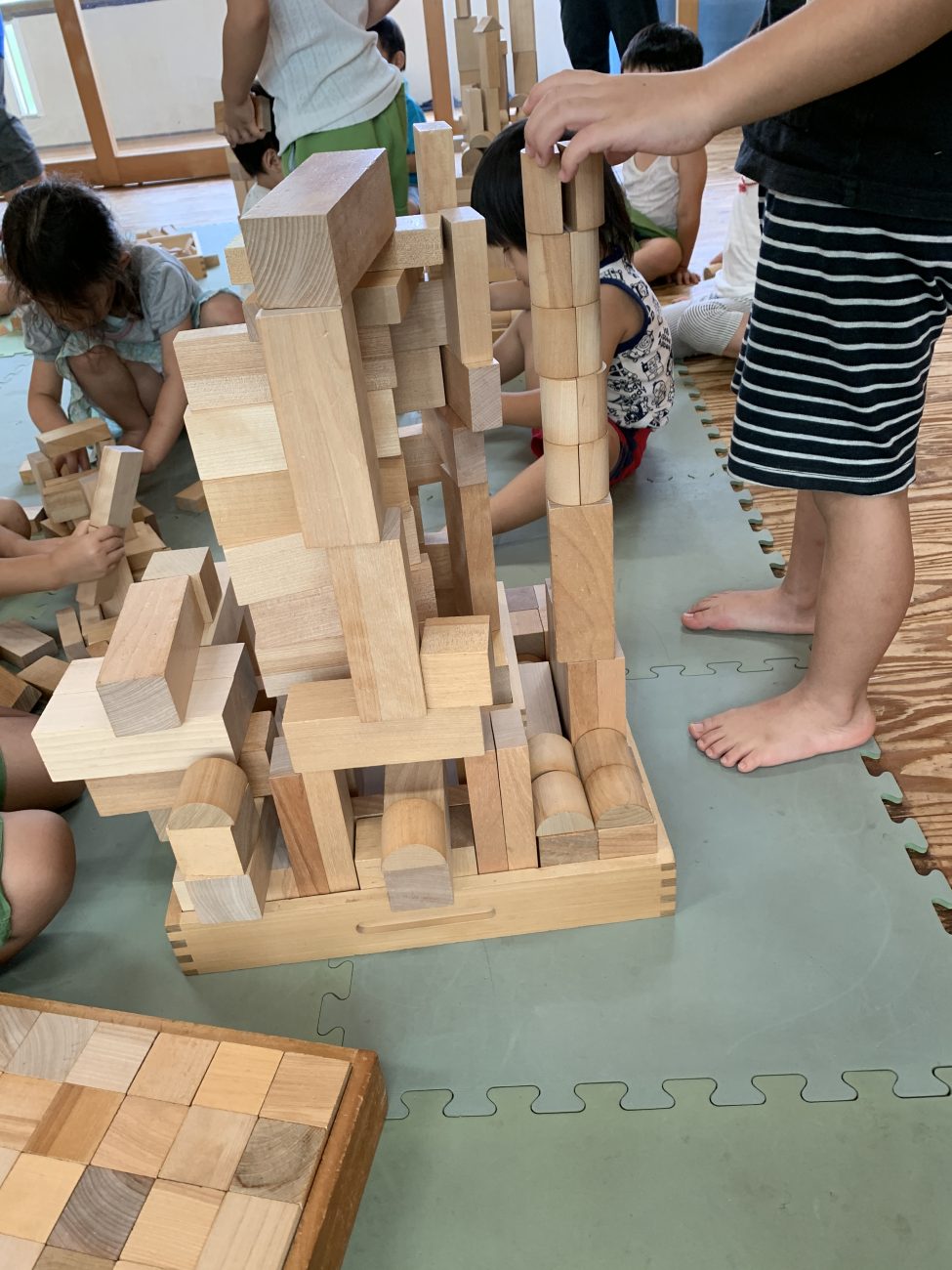 うめ組の頃から童具(積木)を使って遊んでいるきく組の子ども達は、遊びの中で「積木使いたい!」とよく積木遊びを提案してくれます。