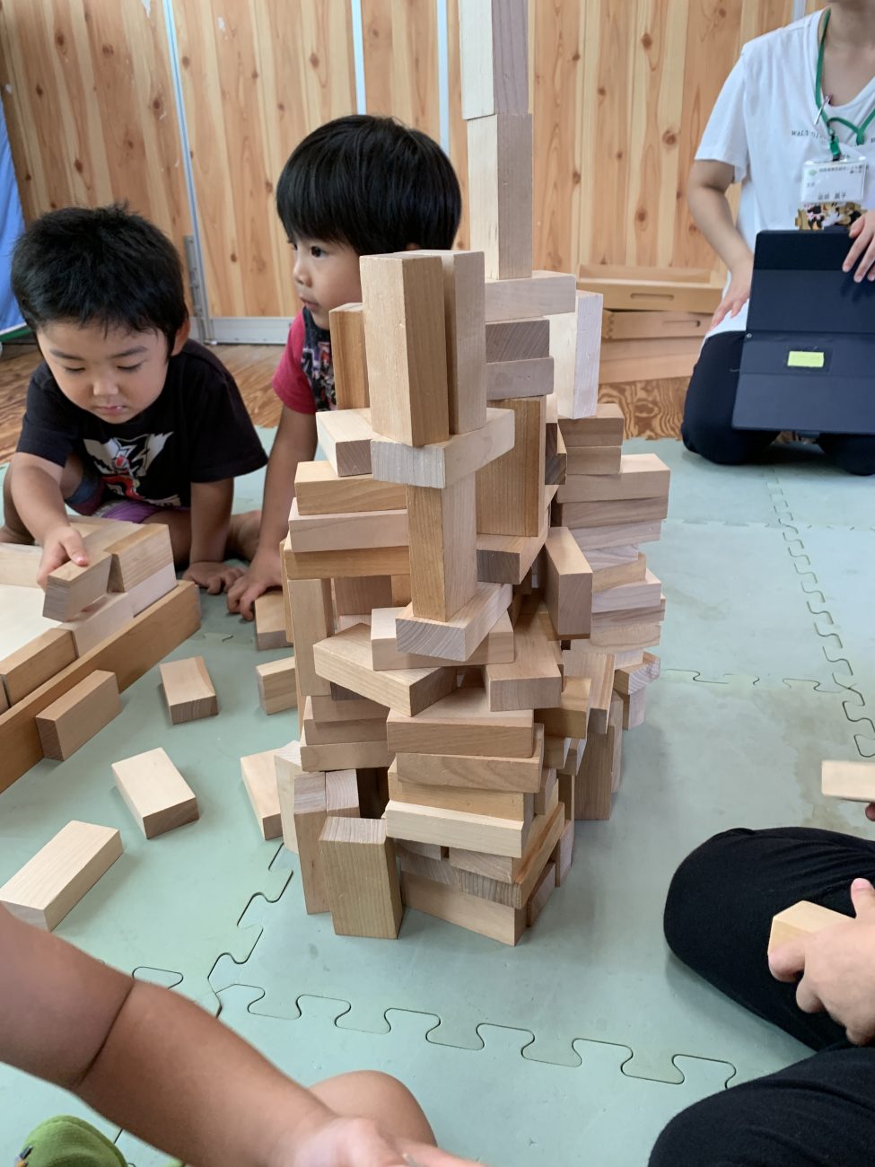 私は、積木遊びをしている姿を見て、友達と協力しながら同じ物をイメージして作っているのかと思っていたのですが、実際のところそれぞれイメージしたものは異なり「中央銀行」や「ディズニーランド」など1人1人が頭の中で何を作りたいかを考えていました。