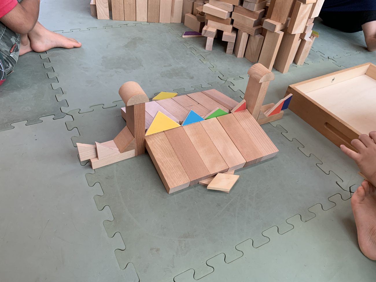 今までも積木遊びを行ってきましたが、何度も繰り返し遊ぶ事で、子ども達なりに考えた方法で積木遊びを楽しむ姿が見られるようになりました。