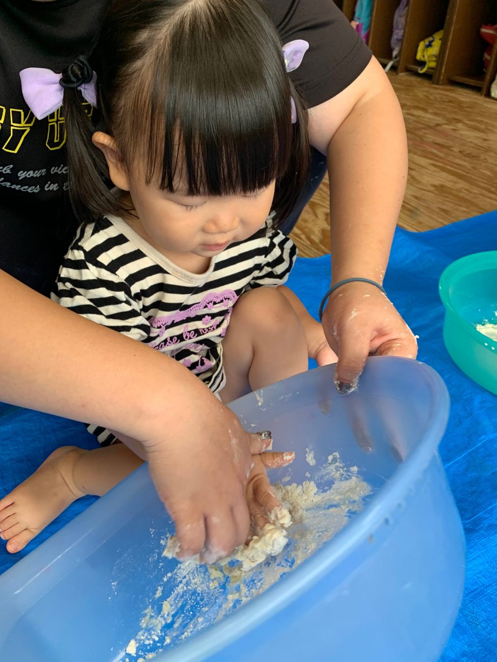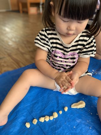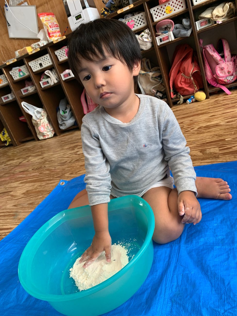小麦粉をこねていき、だんだん粘土っぽくなると子どもたちは、「すごいね!」「粘土みたいになったね!」と言う姿も見られました。粘土になると丸めたり、ちぎったり、握ったりしてそれぞれ感触を楽しんでいました。手で触ることが苦手な子は足で踏んだり、指先で触ったりして子ども達なりに遊び方を考えていたようです。