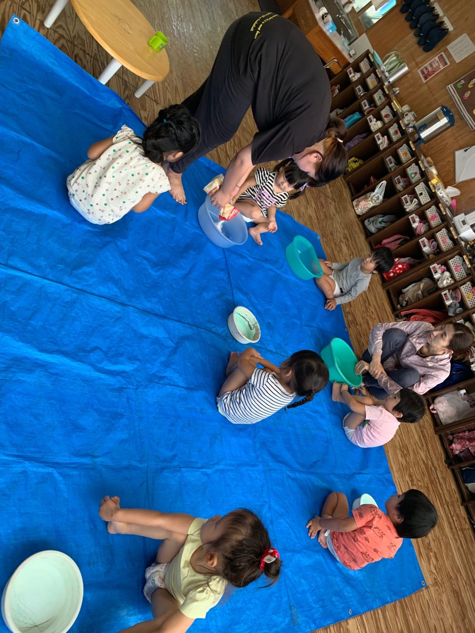 まず、タライの中にサラサラの状態の小麦粉のみを入れ触ってもらいサラサラの感触を楽しんでもらいました。その中で、小麦粉を自分の足にかけたり、腕にかけ、「砂みたいだねー!」という声も聞こえました。