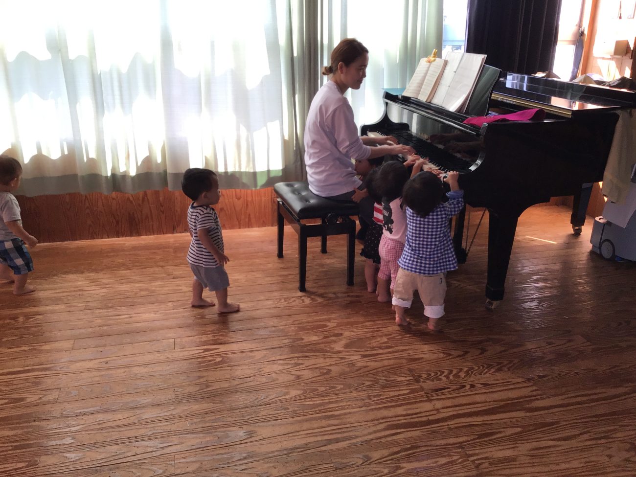 本日のリトミックでは、0歳児は音がピアノから出ている事に気付き興味を持っていました。