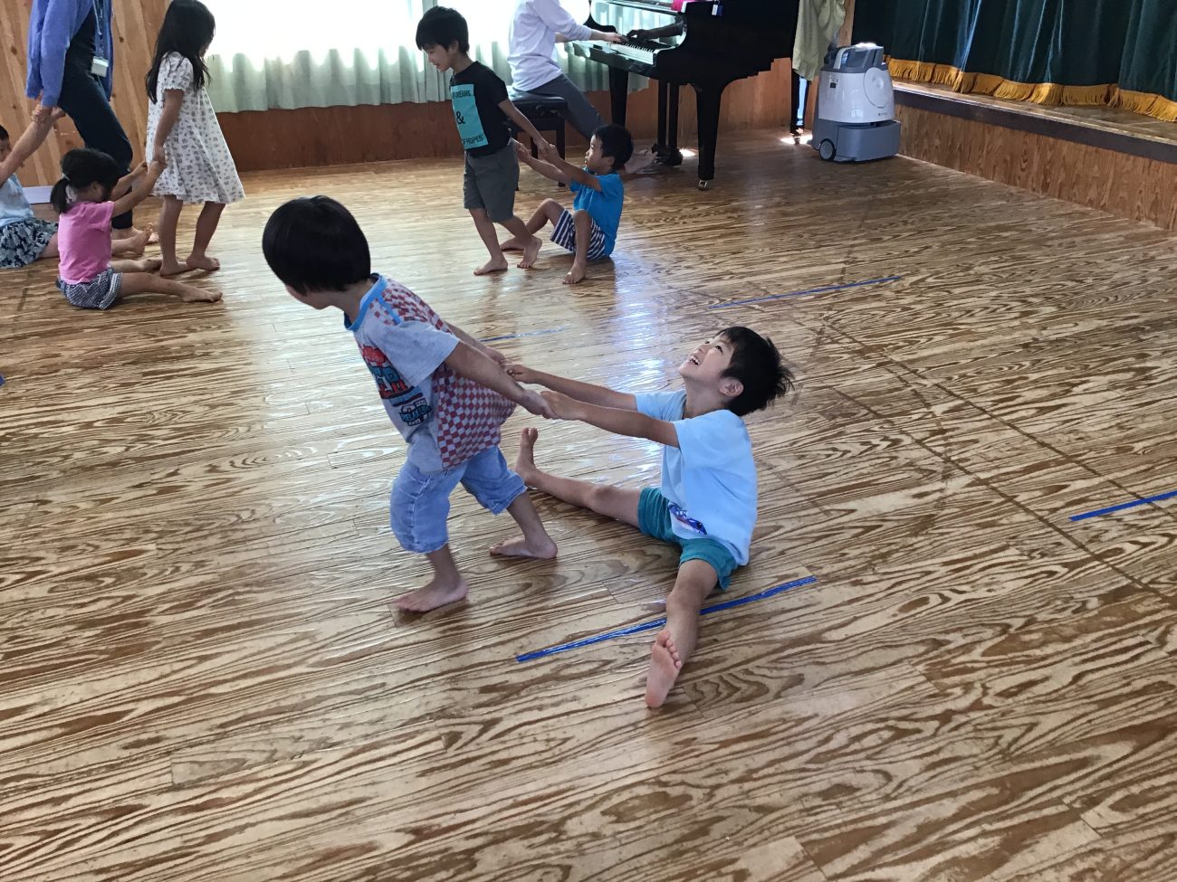 こちらは「そり」という動きです。2人組になり、1人はそりになり、1人はそのそりを引っ張って動きます。引っ張る子どもは腕の力と足を思い切り踏ん張って前に進もうとします。この動作が腕や親指の付け根の筋肉の発達を促すねらいがあります。
