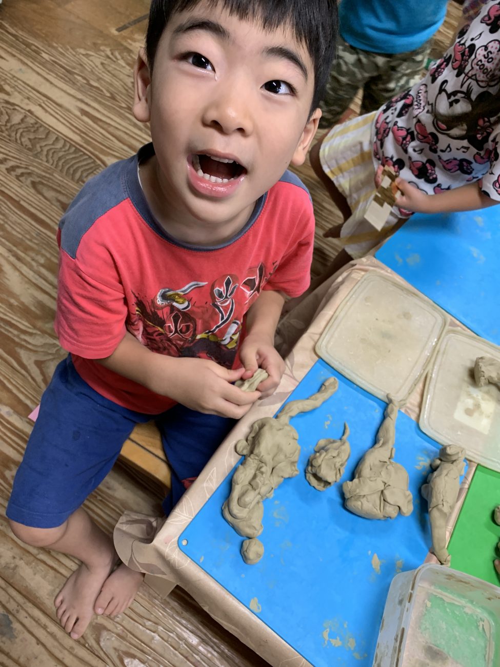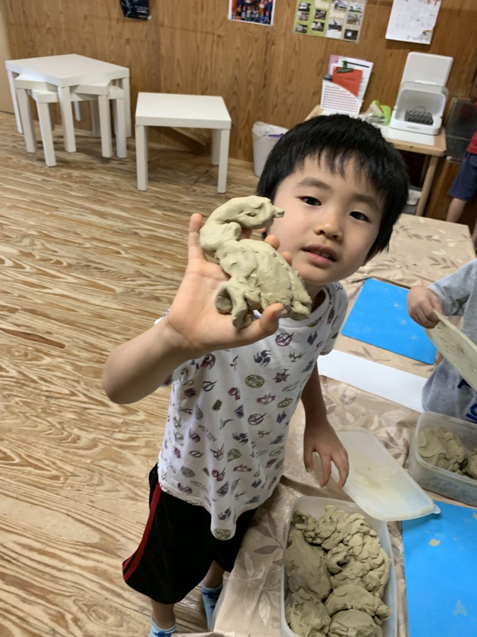 保育園に帰ると、早速「もも組博物館を作りたい」との声が。段ボールや紙粘土を使って博物館で見た昆虫や恐竜を作りました。