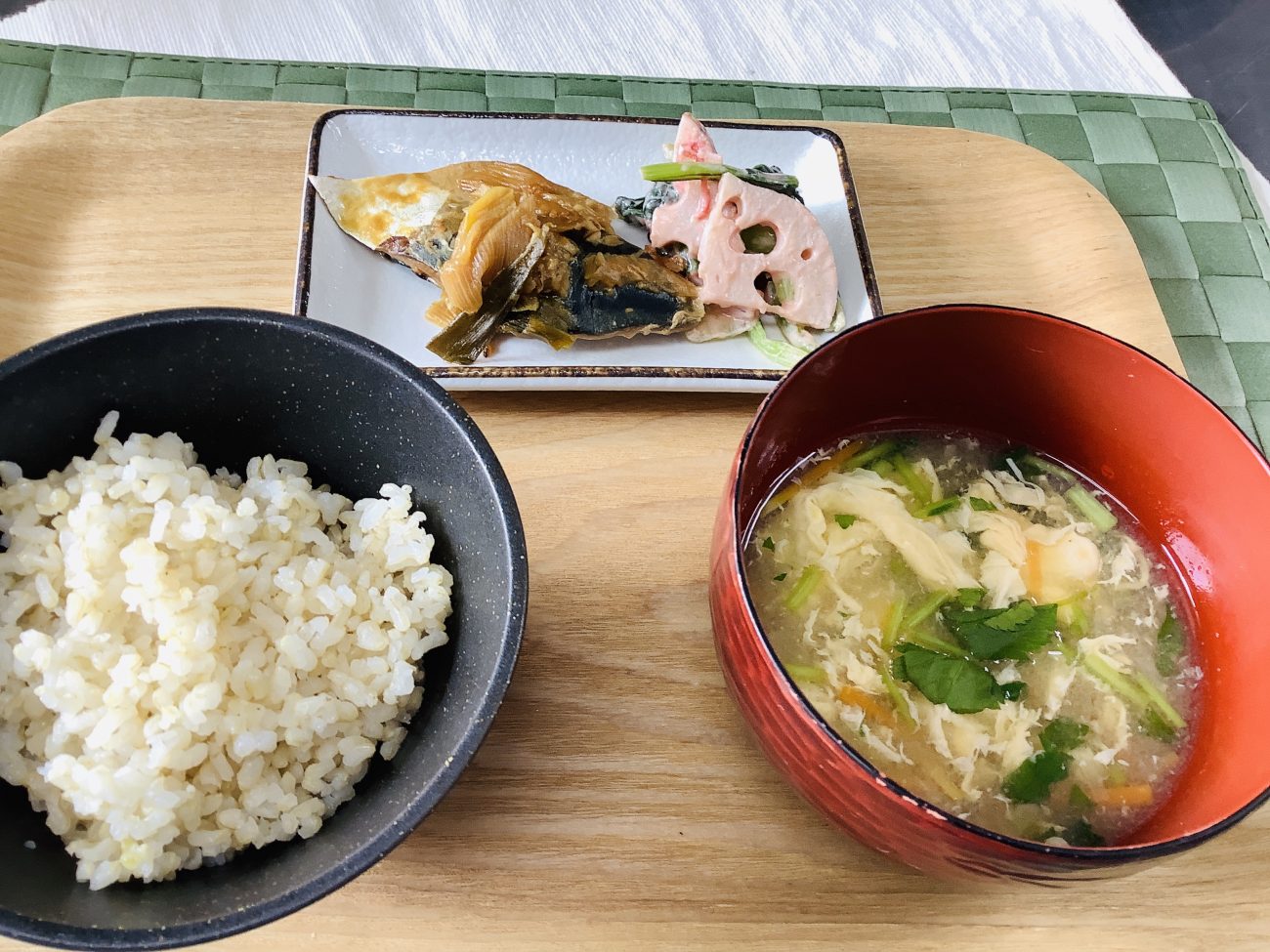 今日のメニューは“サバの味噌煮”“小松菜とれんこんの梅ゴマ和え”“みつばのかき玉汁”でした。