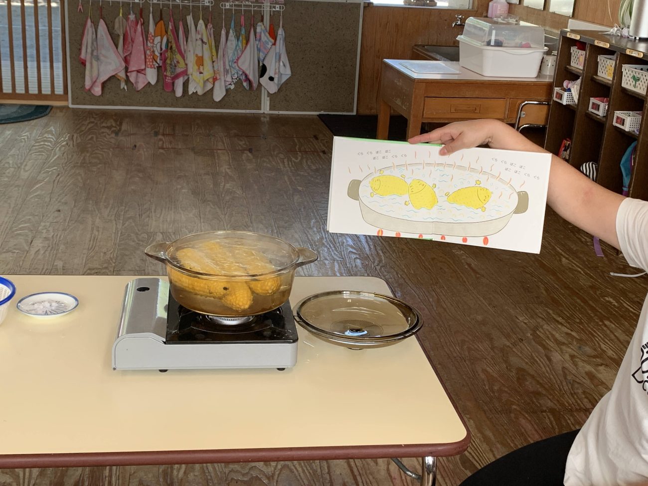 沸騰したお湯を見て、Rちゃんは「お風呂みたいだね」と言ったり、Kくんは「(鍋の)下からブクブクなってるよ」と角度を変えて観察している姿に絵本からは発見出来ないことも実際に子ども達と経験することで発見に繋がることがあるのだと改めて感じました。
