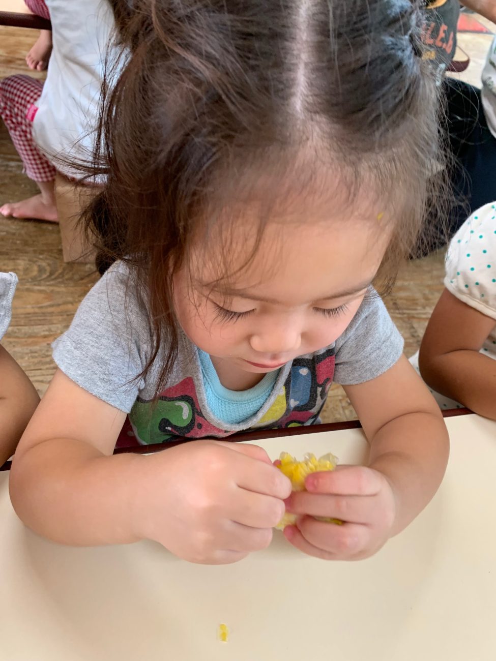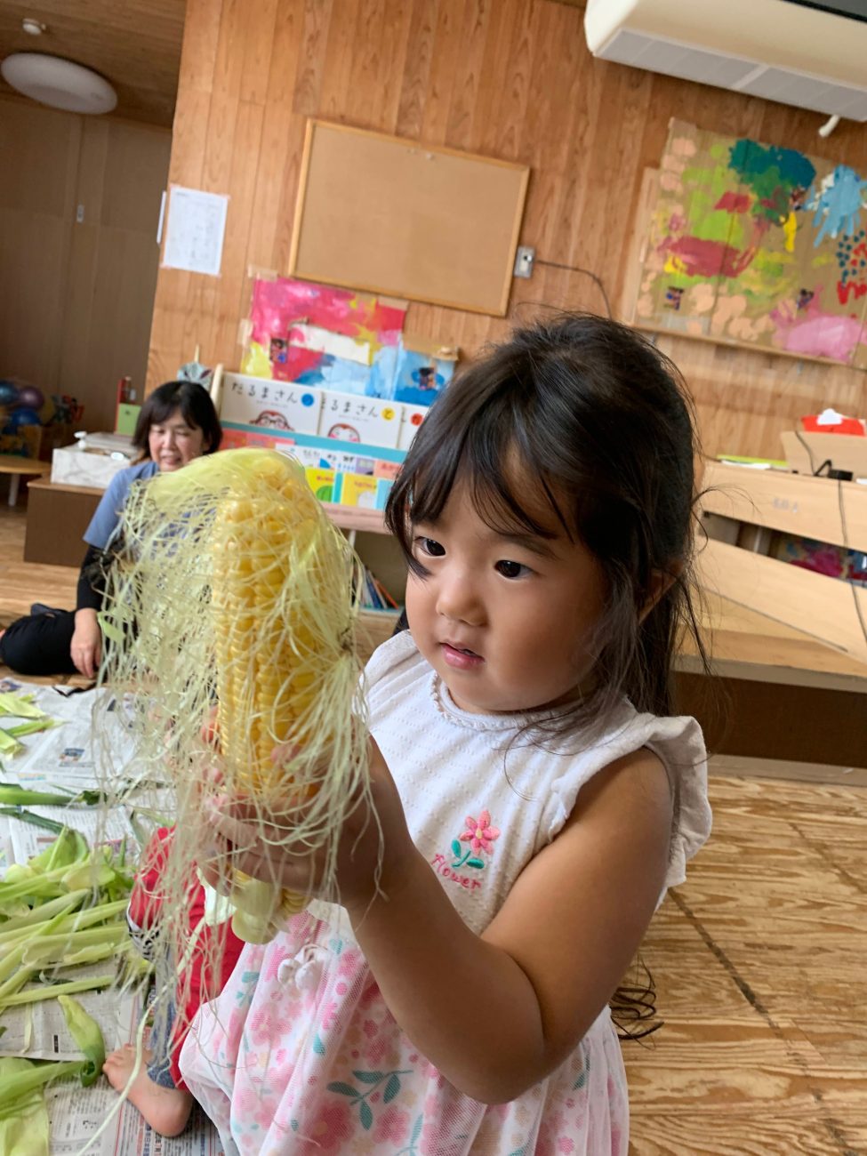 今の時期はいろいろな素材に触れ、楽しんだり感触を味わったりする経験が大切だと言われています。今回は自分たちが食する食材に触れ、皮やヒゲ、生のとうもろこしの感触を味わうことができとてもいい経験ができたのではないかと思います。また、今後も子ども達の声を聞き、少しずつでも食に感心をもってもらえるよう一緒にクッキングをしていきたいと思います。