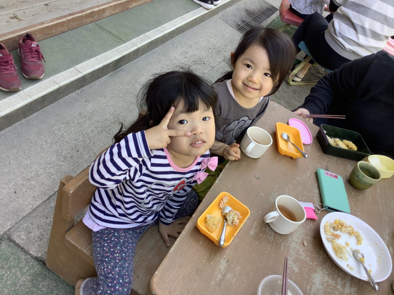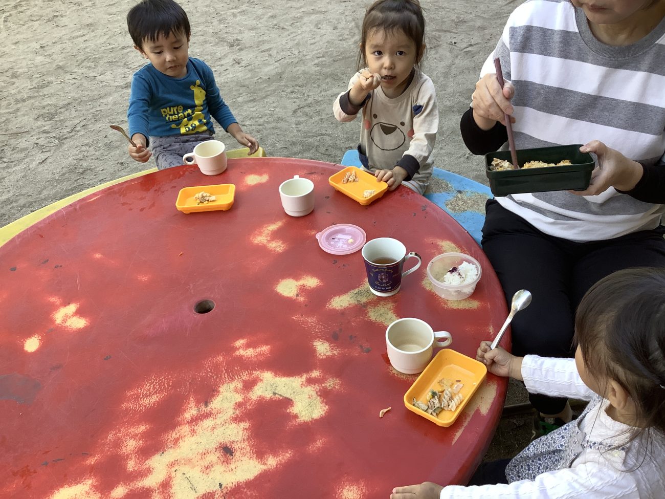 今日はゆり組さんがお外で食べていました!昼間はまだ暖かく、外でも過ごしやすいのでとても気持ちよさそうでした。おかわりにもたくさん来てくれました????