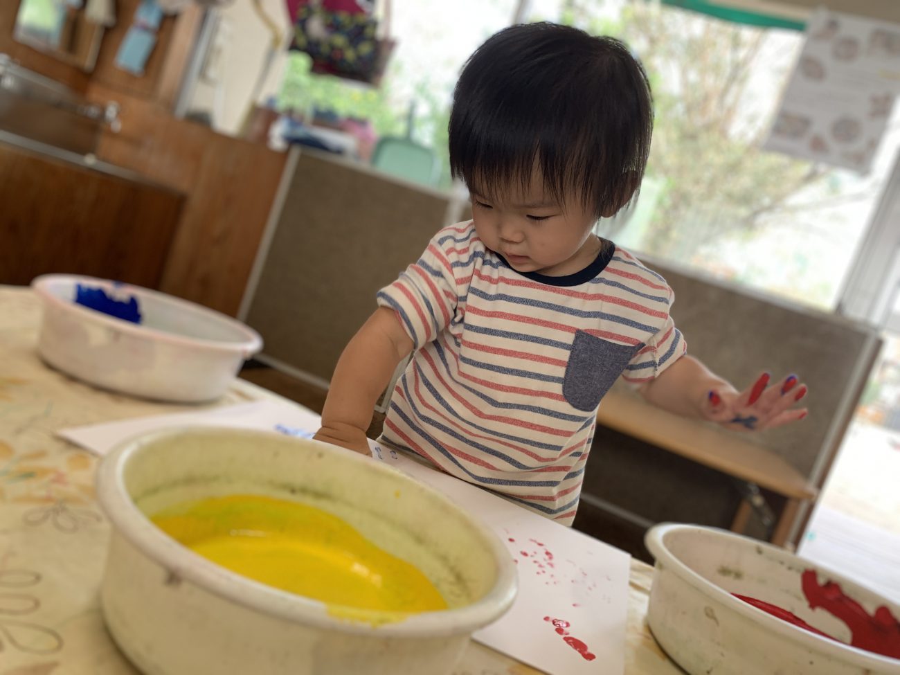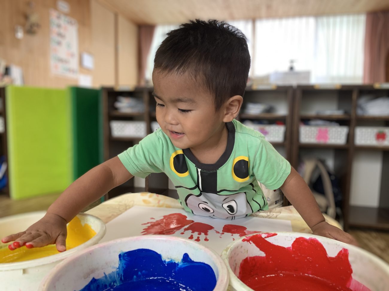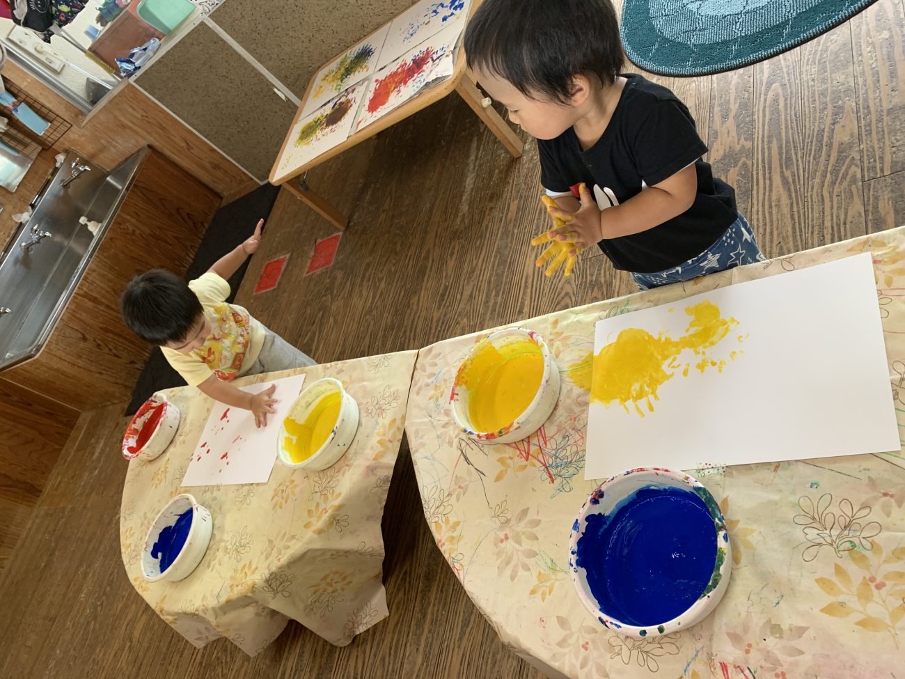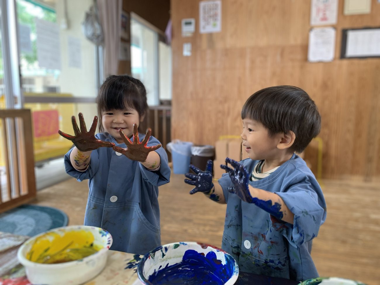 少しずつ難易度を上げていくことで最初の頃は恐る恐る触れることが多かった子も今では保育士が準備していると「絵の具するの?」「やりたい!」と目を輝かせ、指先や手のひらを使いながら自由に表現する姿が見られるようになってきました。