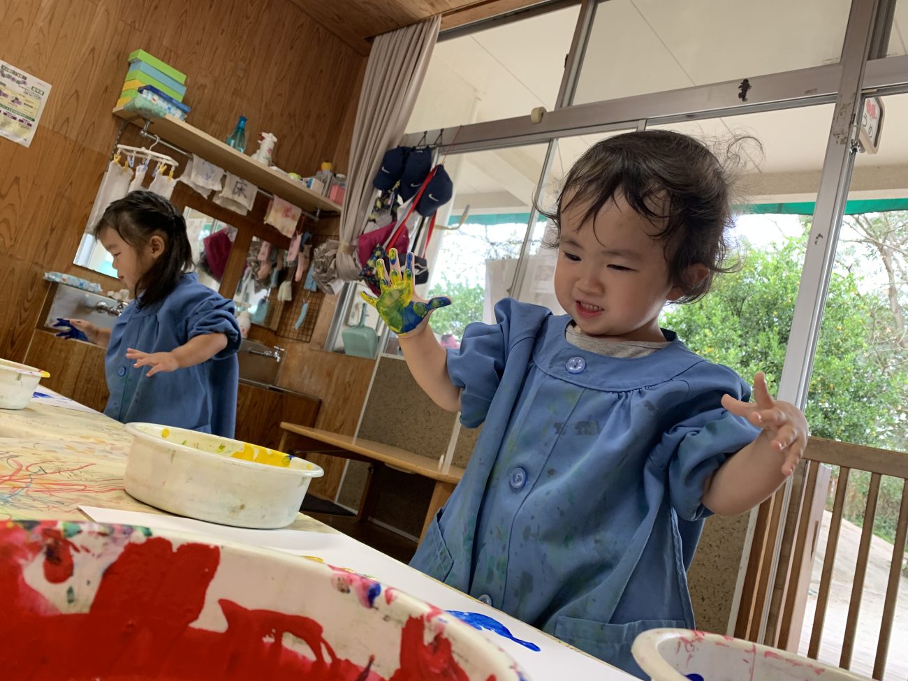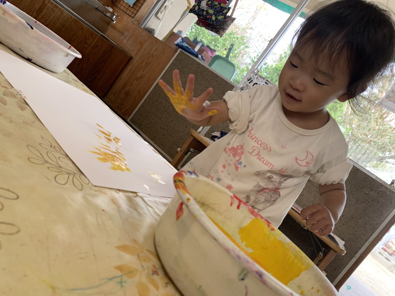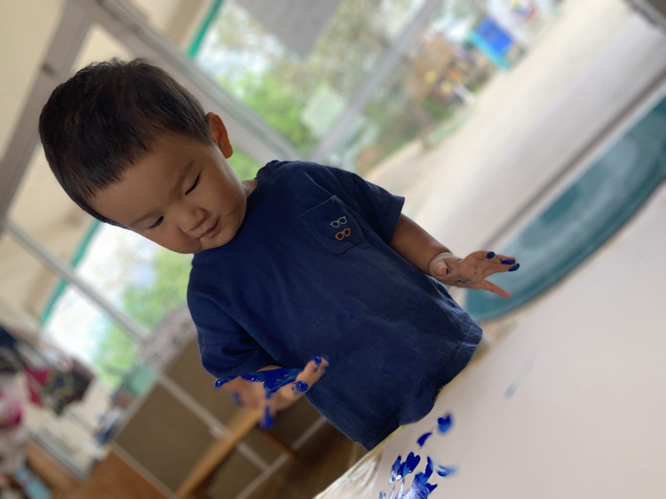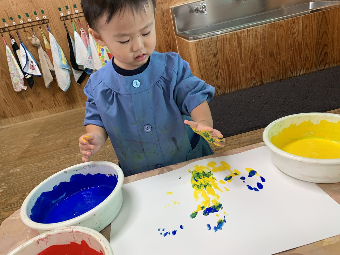 少しずつ難易度を上げていくことで最初の頃は恐る恐る触れることが多かった子も今では保育士が準備していると「絵の具するの?」「やりたい!」と目を輝かせ、指先や手のひらを使いながら自由に表現する姿が見られるようになってきました。