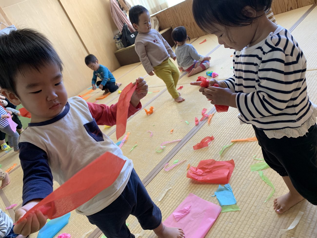 またこの半年間で言葉が増え、「これはあか?」「きれいだね」と保育士に問いかけるだけでなく、一緒に楽しむお友達と声を掛け合ったりお友達の遊び方を真似したりする姿も多く子ども達の成長を遊びの中でも感じています。