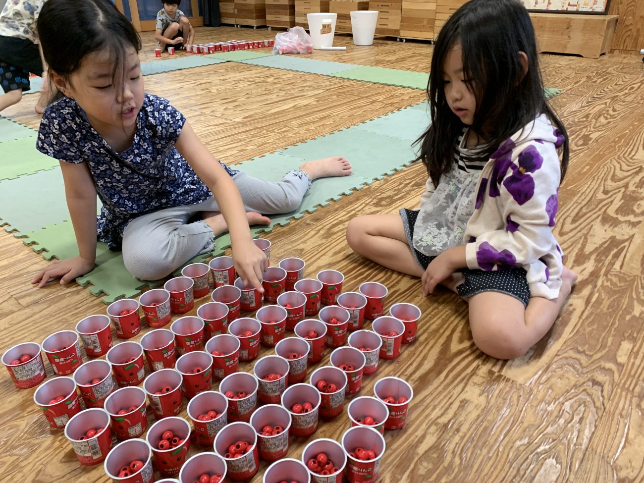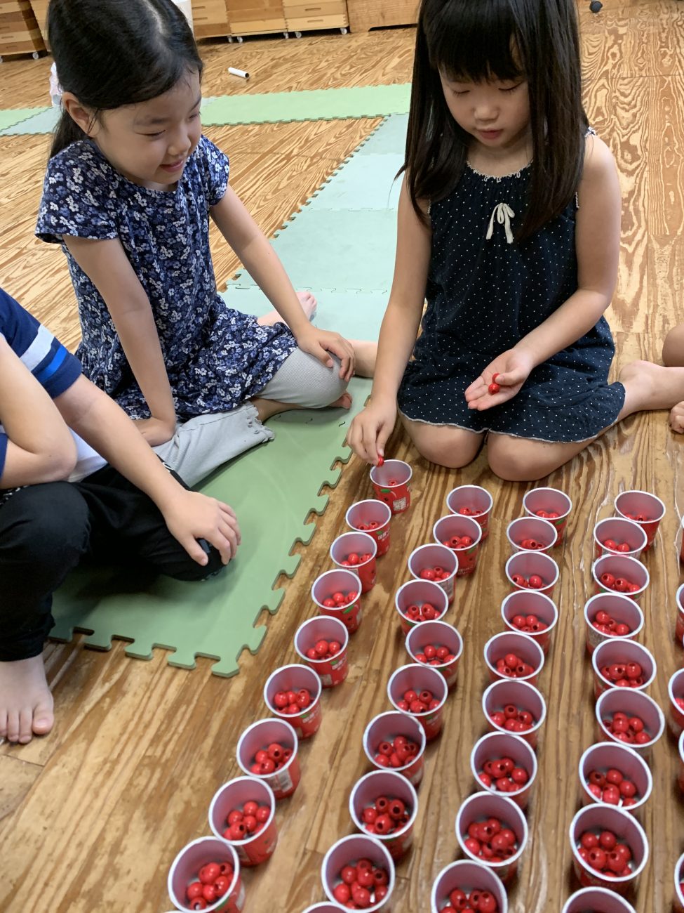 子どもたちは集中力も最後まで切れず、さらに「もっと他の色の果物(ビーズ)も数えたい!!」という声があがり、驚きました。
