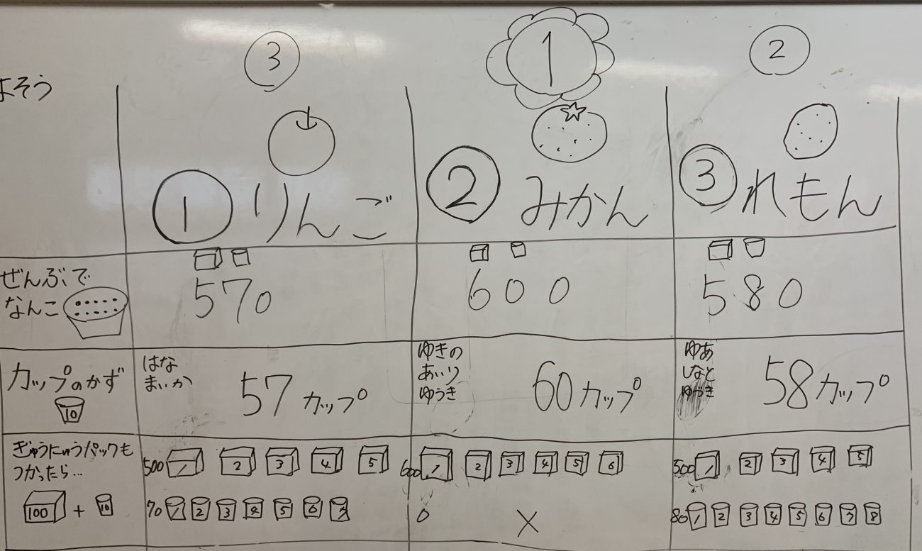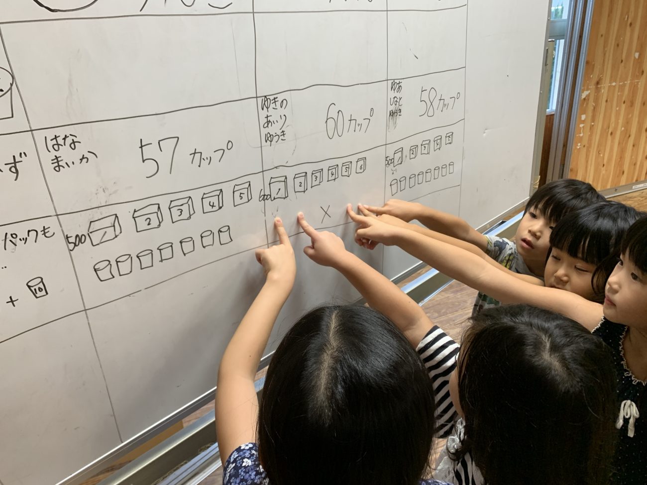 最後に、ホワイトボードにカップや牛乳パックの数を整理してまとめ、