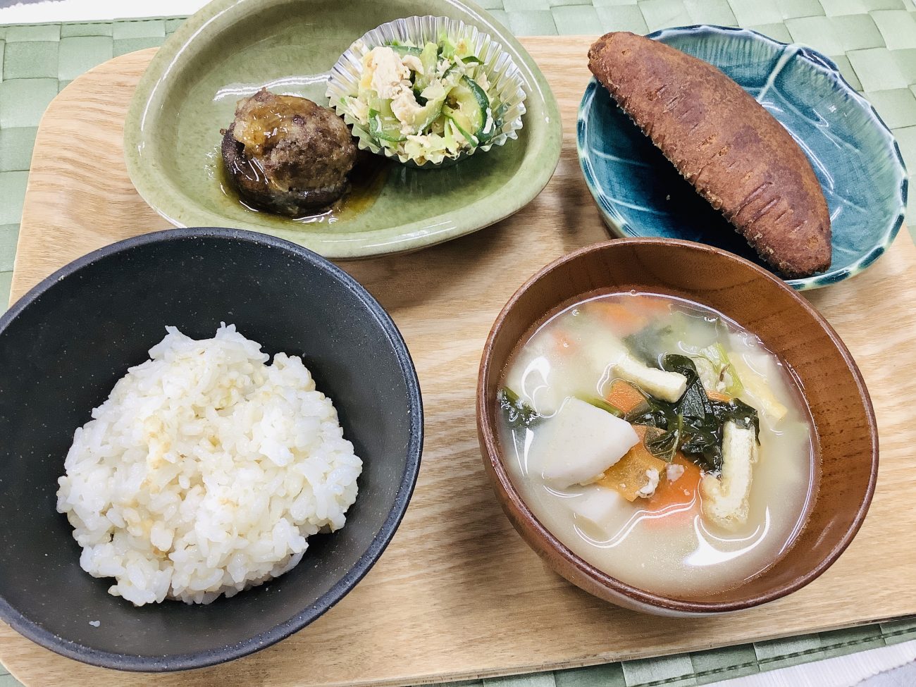 今日のメニューは“椎茸の肉詰め焼き”“鶏肉ときゅうりのゴマ和え”“里芋のみそ汁”でした。
