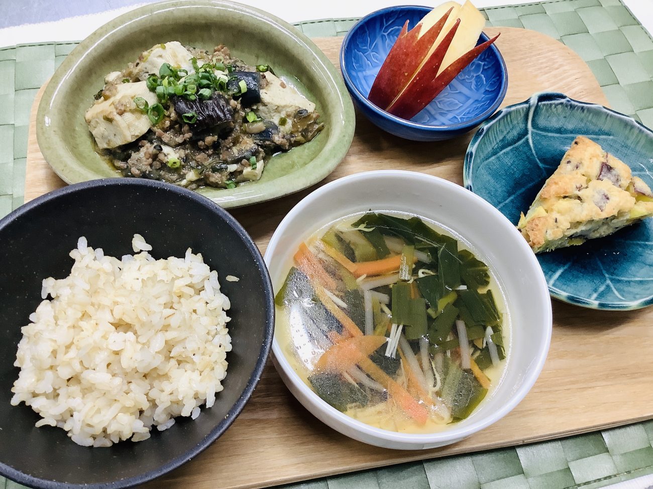 今日のメニューは“マーボーなす”“中華スープ”“りんご”でした。