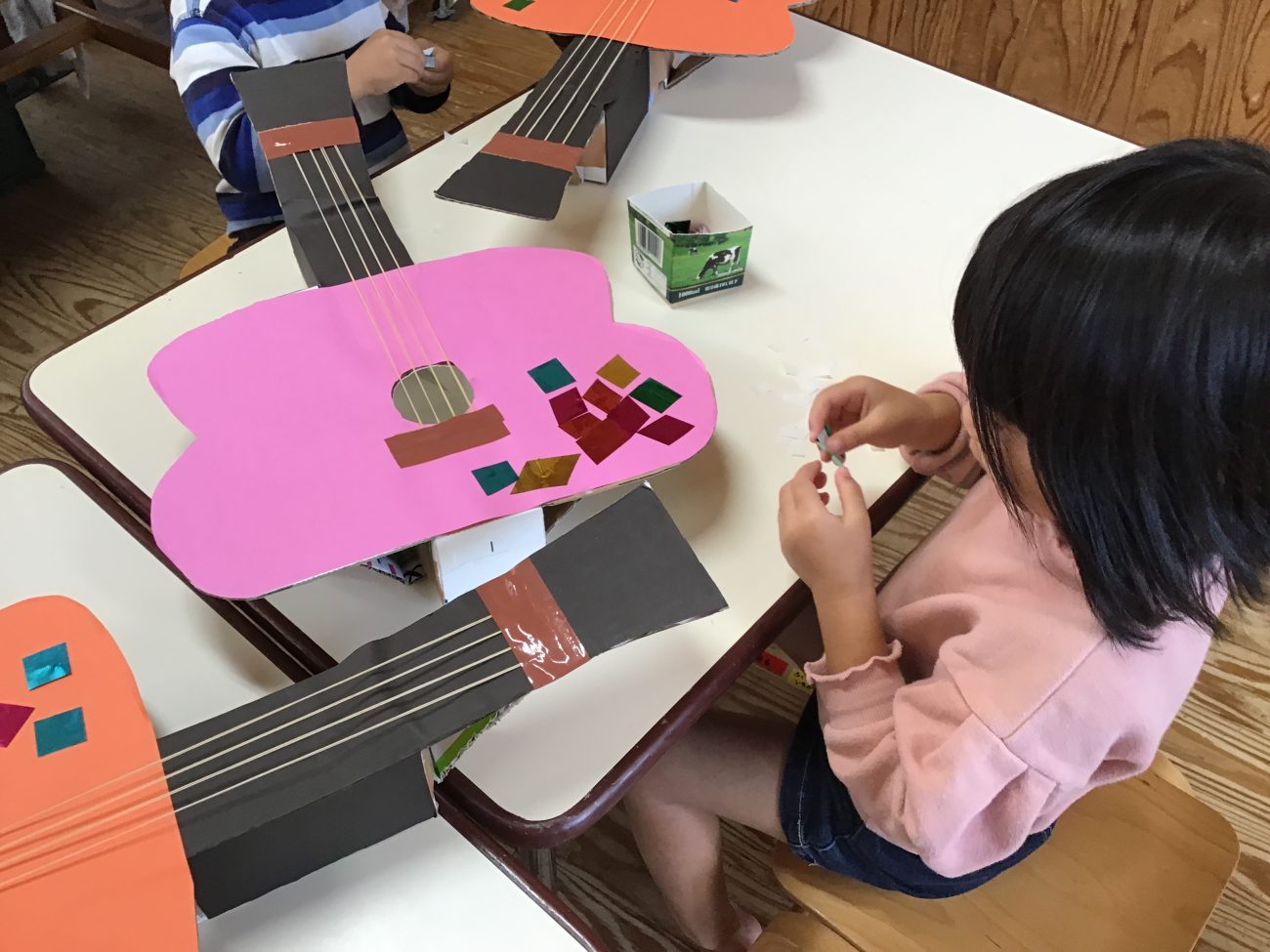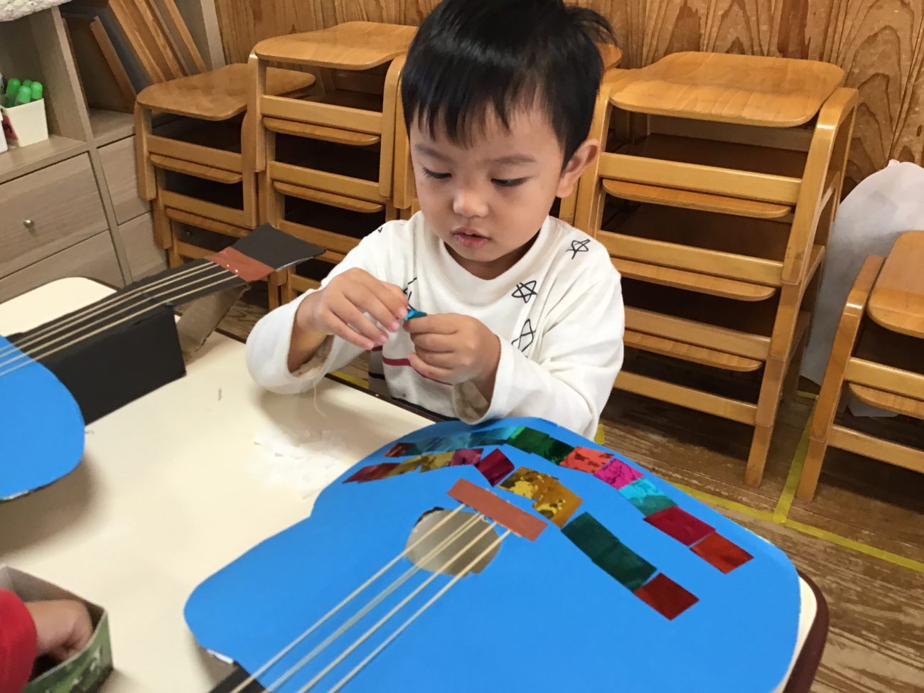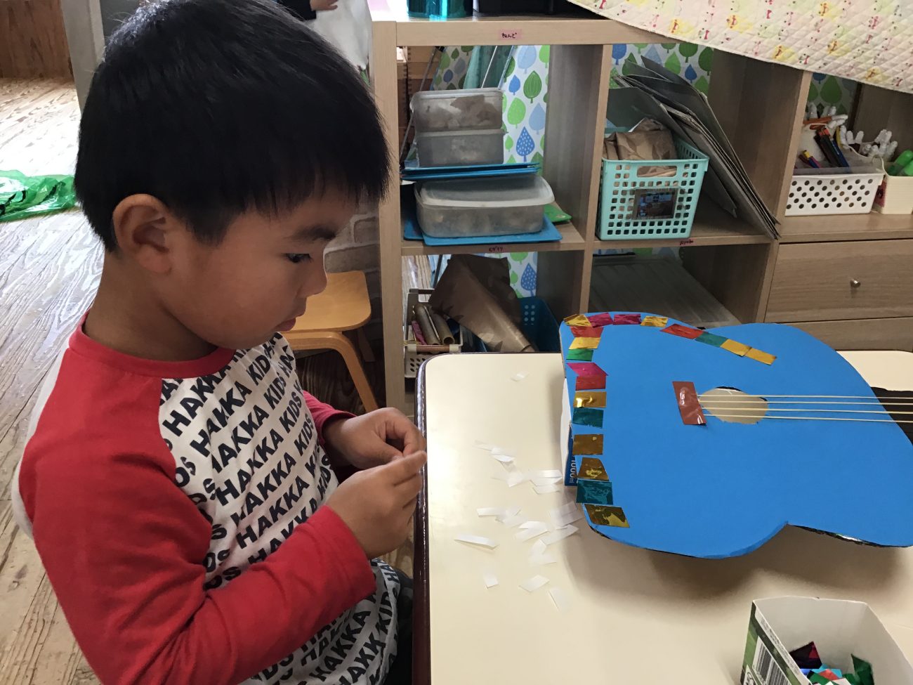 話し合いの中で「ギターを弾きながら歌いたい!」と意見が出てきたので、保育士が土台を作り子ども達に渡すと、各自イメージを持ちながら、色のついたテープを使い、並べて貼る姿や、ランダムに貼る姿が見られました。