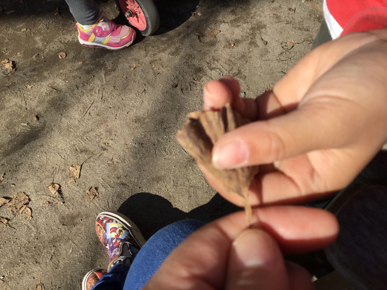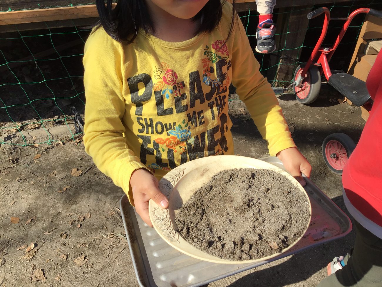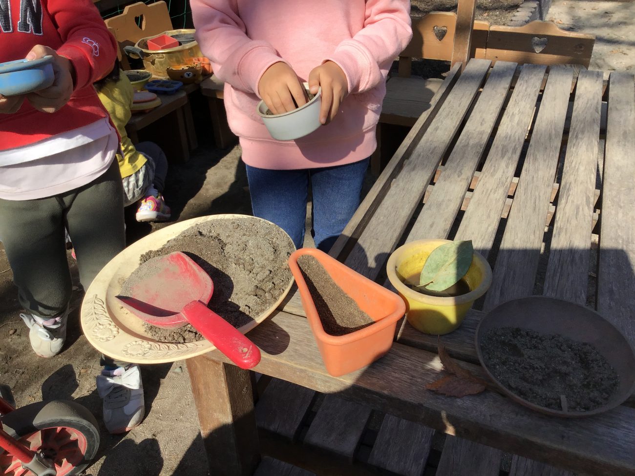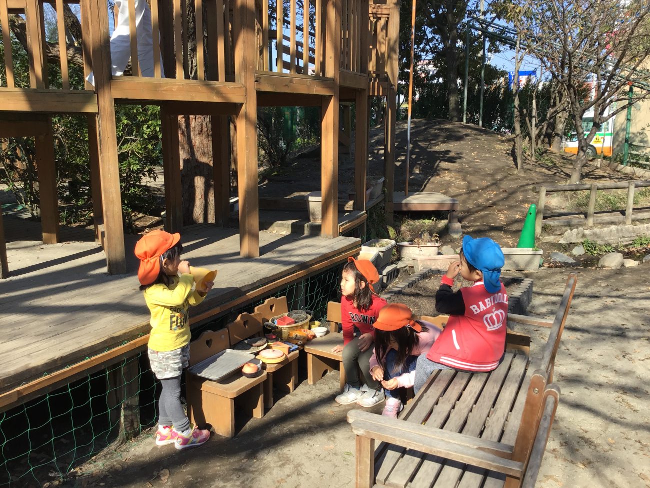 11月下旬。園庭でもも組(4歳児)の女児3人が、ごっこ遊びを楽しんでいました。「さやか先生、お客さんになって!」と誘われ、仲間入り。遊びの最中は、子ども達は役になりきって台詞や動きがとてもリアル。つい私もその雰囲気にのまれて、お客になりきってしまいました。そんな様子を近くで見ていたきく組(3歳児)も、自然と遊びに加わり、とても賑やかな“お店やさんごっこ”となりました。